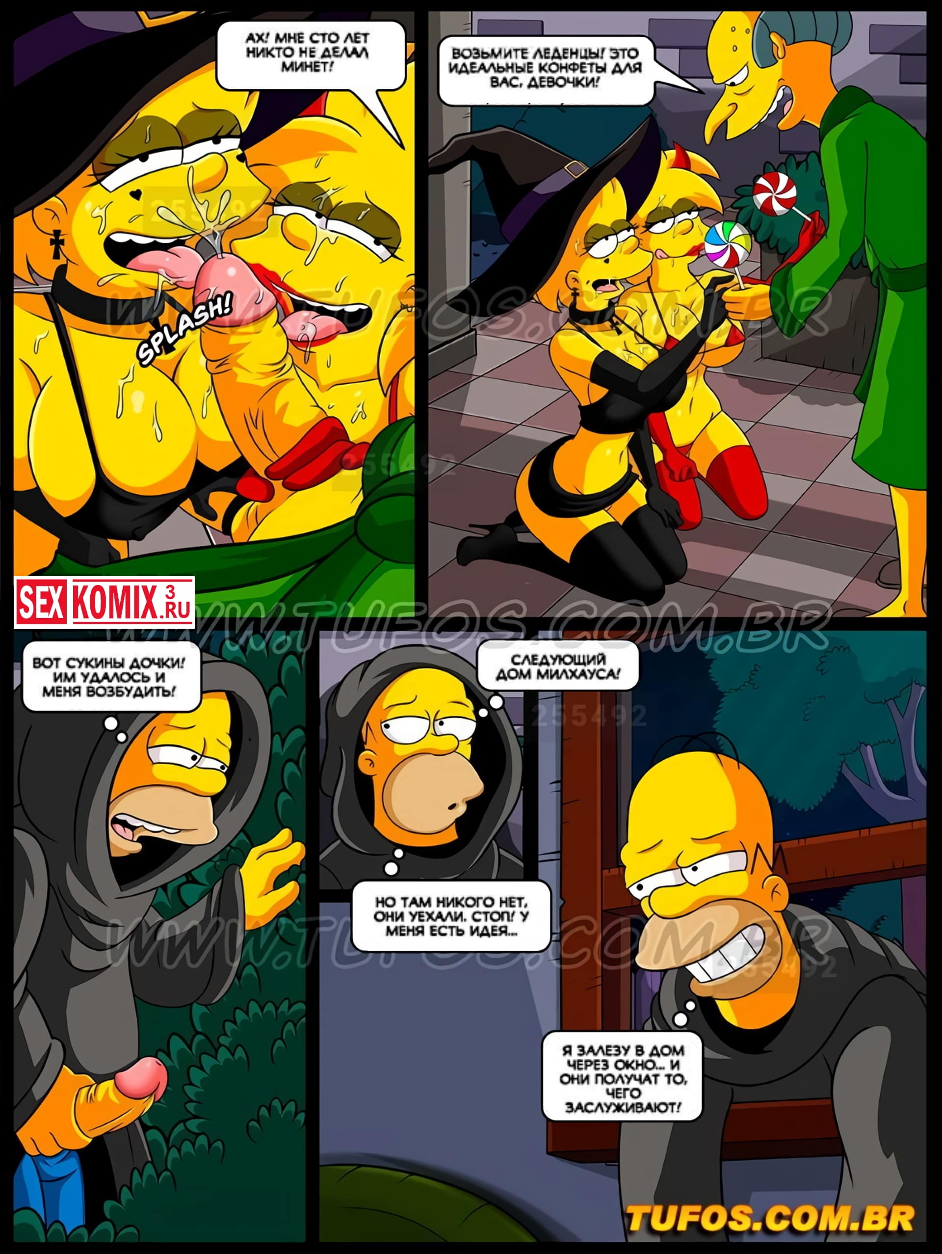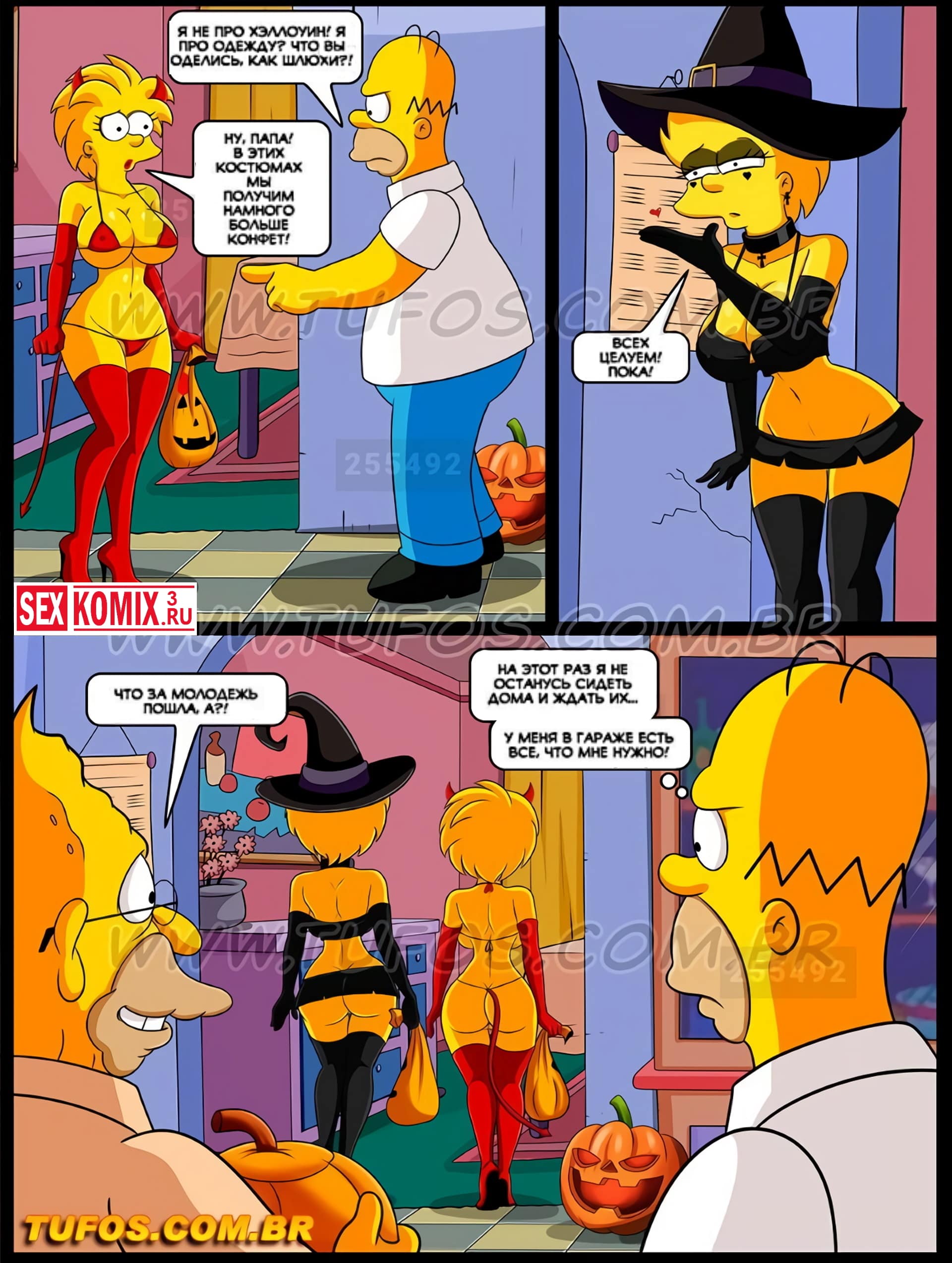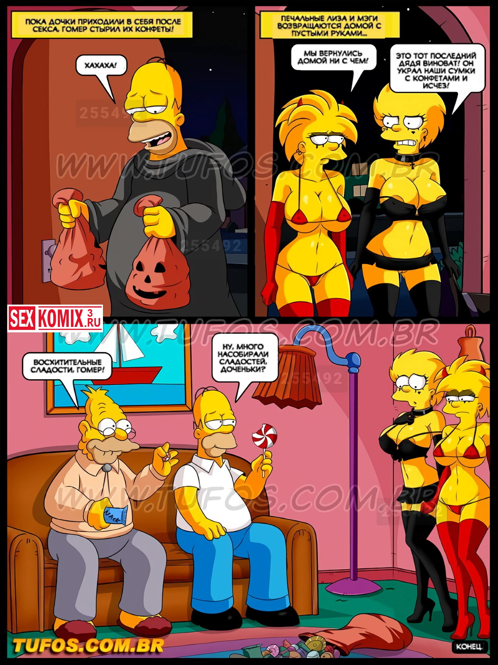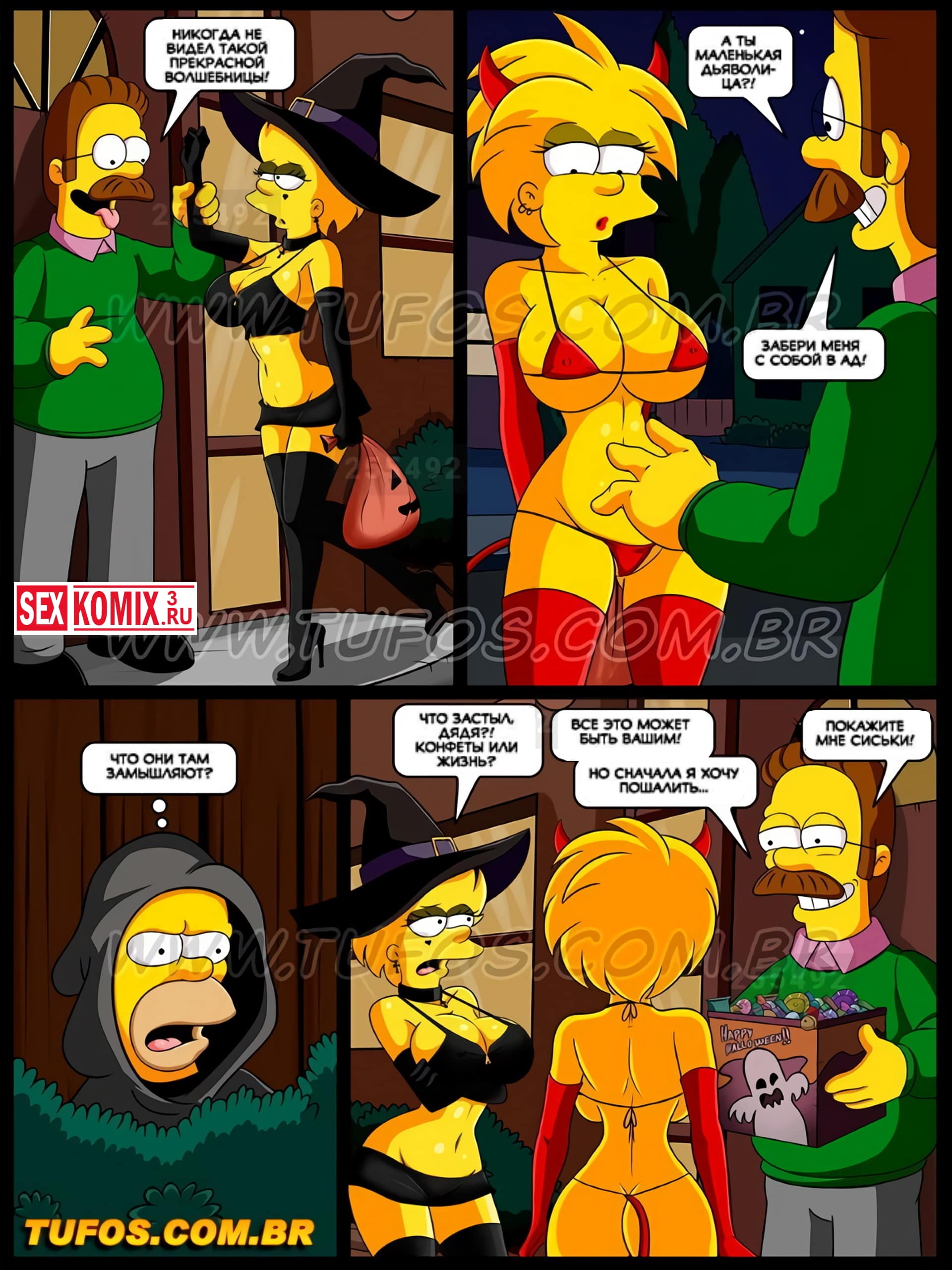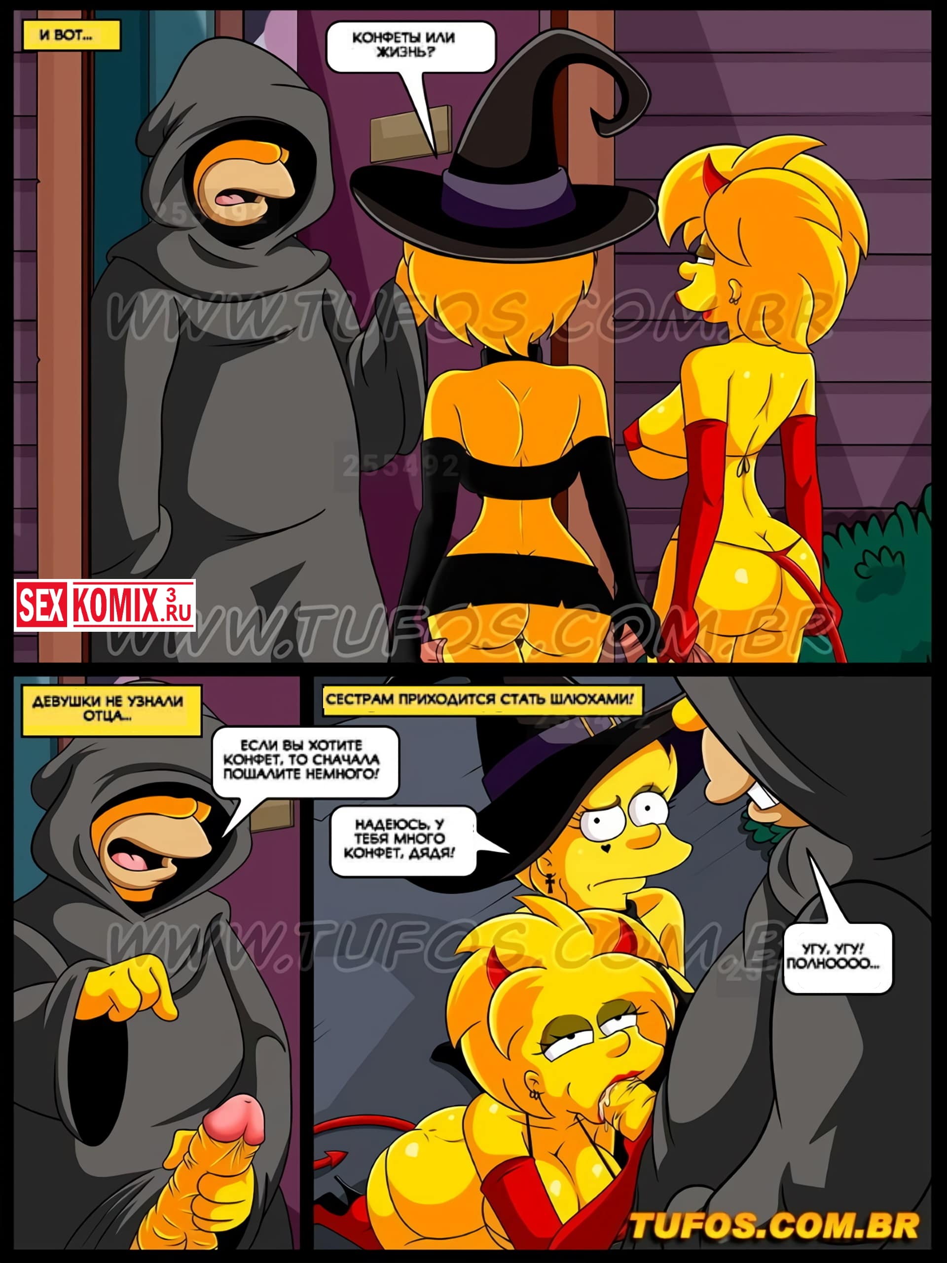 Порно комикс Симпсоны. Часть 13. Ночь на Хэллоуин. Наступил вечер, вся семья готовиться к празднику. Лиза и Меги нарядились в развратные костюмы и собрались пройти по соседям, за конфетами. Но их увидел Гомер и был очень озадачен вызывающими костюмами своих дочерей. Просьбу переодеться в что-то менее сексуальное девушки проигнорировали и он решил проследить за ними. Оказывается они социально так оделись, чтобы собрать побольше конфет. Сестры показывали свои большие сиськи соседским мужчинам, и те щедро награждали их за это.