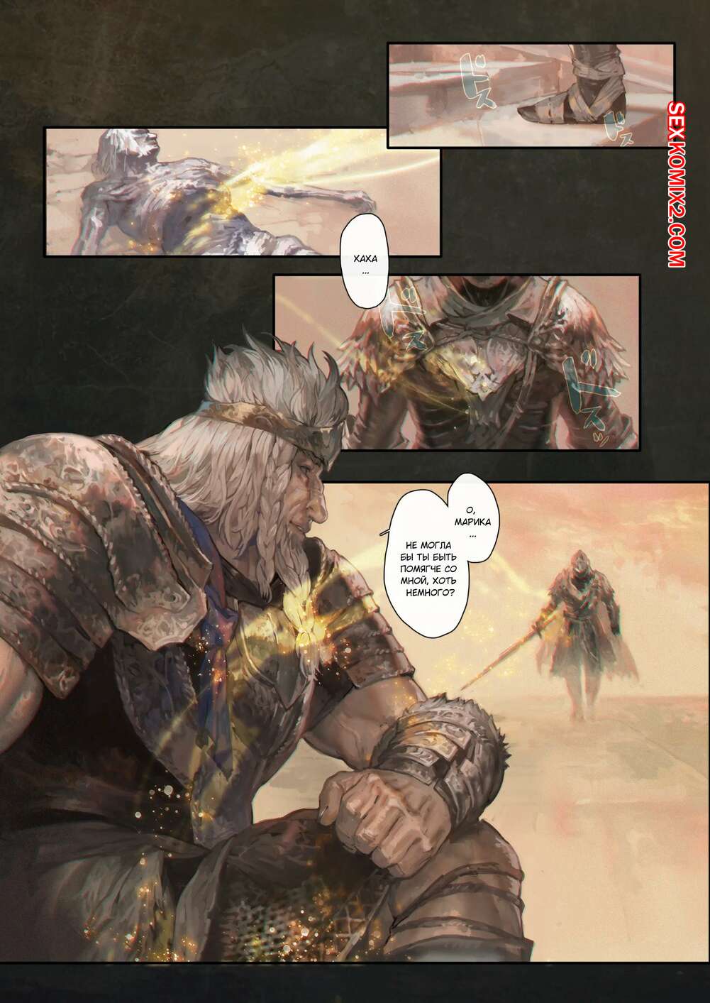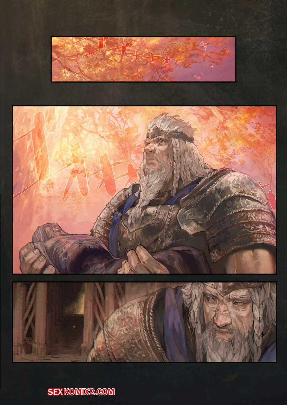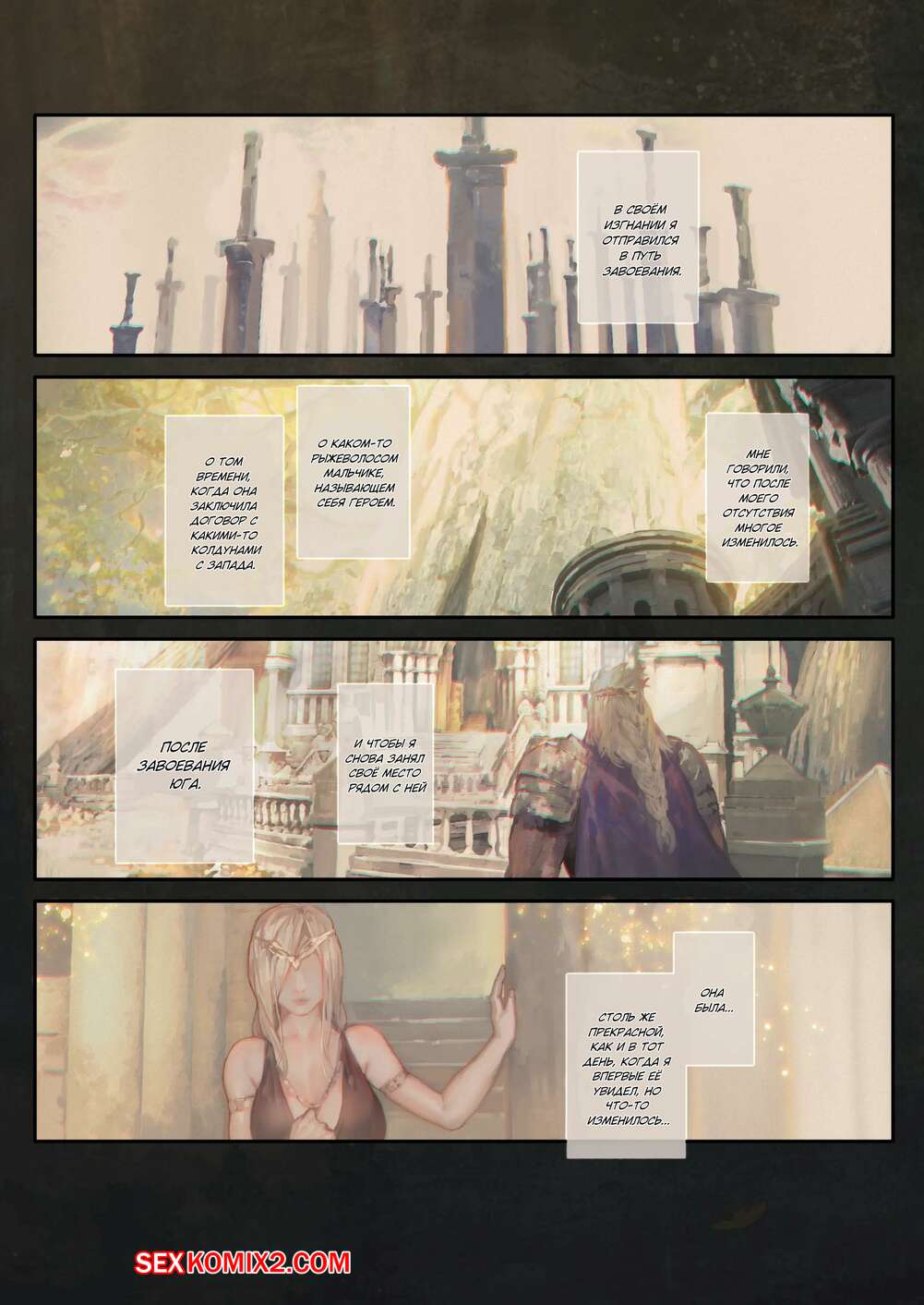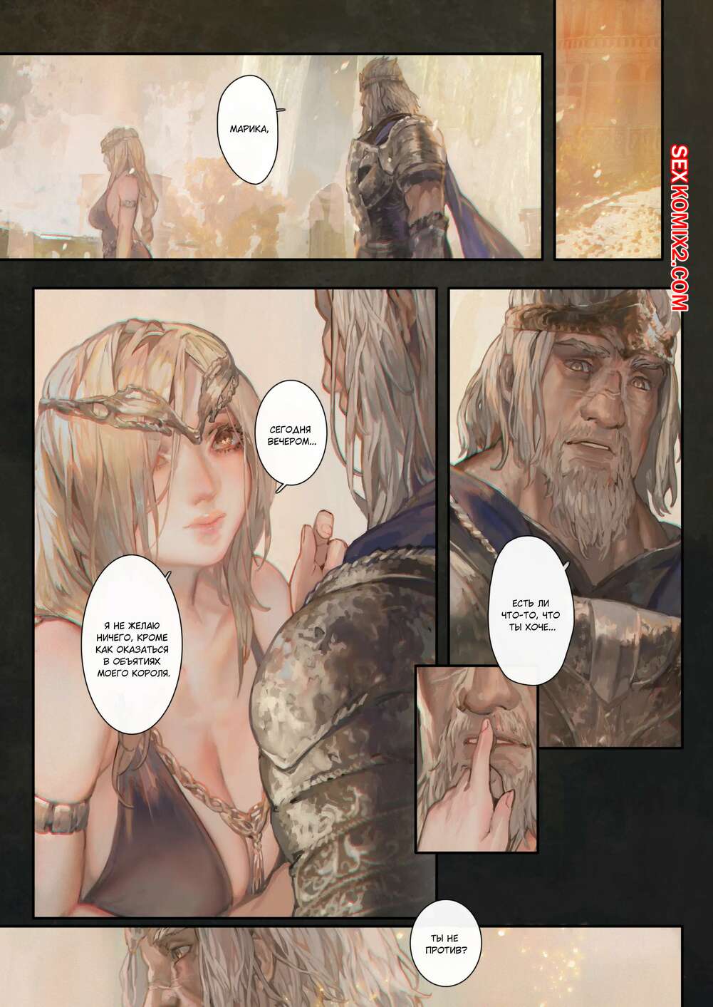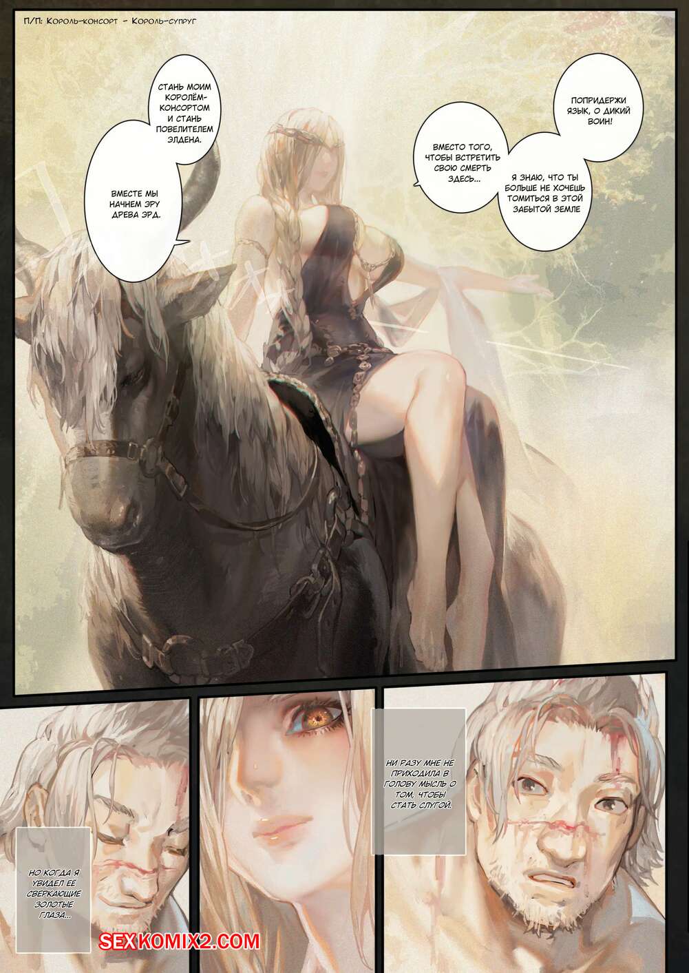 Порно комикс У подножия Древа Эрд. Ougonjiyu Fumoto Король хотел расслабиться, поэтому он отправился на встречу с горячей сисястой красоткой. Блондиночка разделась перед ним и стала сосать его большой хуй, после чего дала ему себя выебать и кончить в нее.