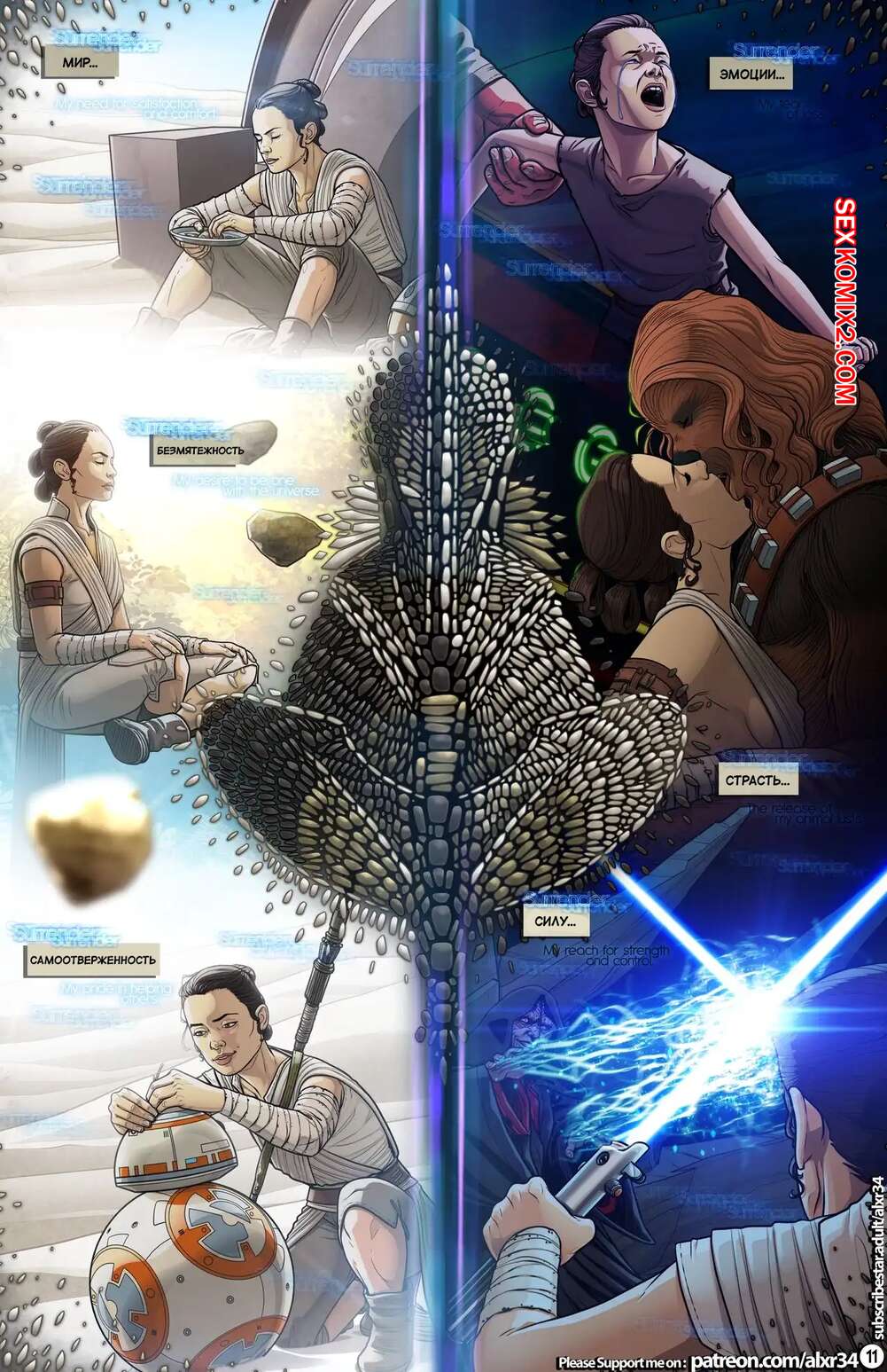Порно комикс Звёздные Войны. Руководство по Спариванию с Вуки. Часть 6. Alxr34 Горячая красотка Рей находится в плену и ей приходится бысть настоящей шлюхой, ебущейся с клиентами. Девушка сильно провинилась и ее привели в ложе Асоки, которая хочет наказать девушку.