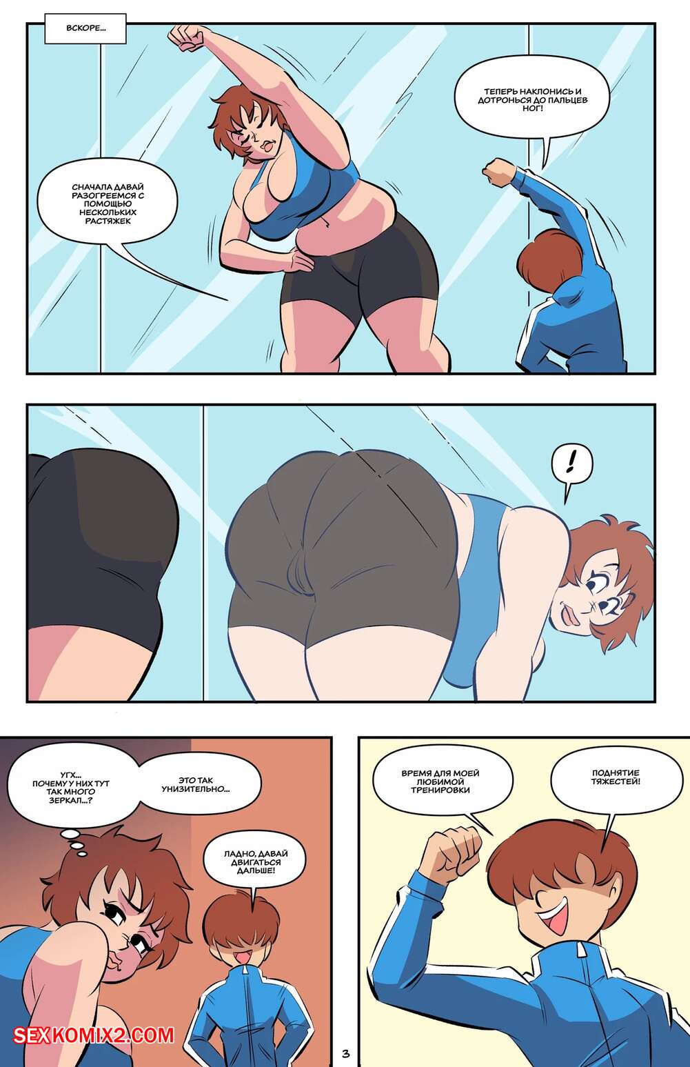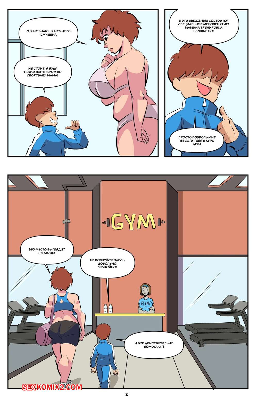 Порно комикс Тренировка в день матери. Mothers Day Workout. Glassfish. Парень отправился в тренажерный зал со своей горячей мамкой милфой. Они стали тренироваться, после чего мамочка оседлала хуй своего сына и дала ему себя выебать.