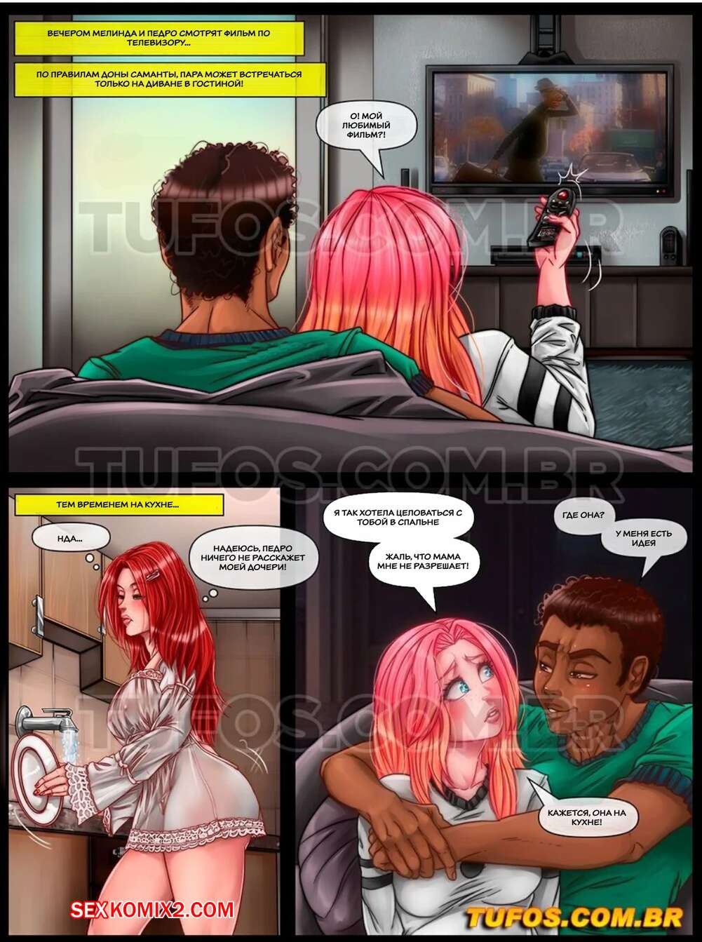 Порно комикс Необычная пара. Пуритане. Святоши. Часть 7. Tufos Темнокожий парень гостил дома у своей девушки и они решили немного пошалить. Красотка разделась и возбудила парня своим шикарным телом, после чего дала ему выебать свою задницу.