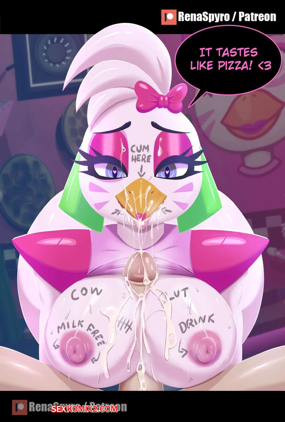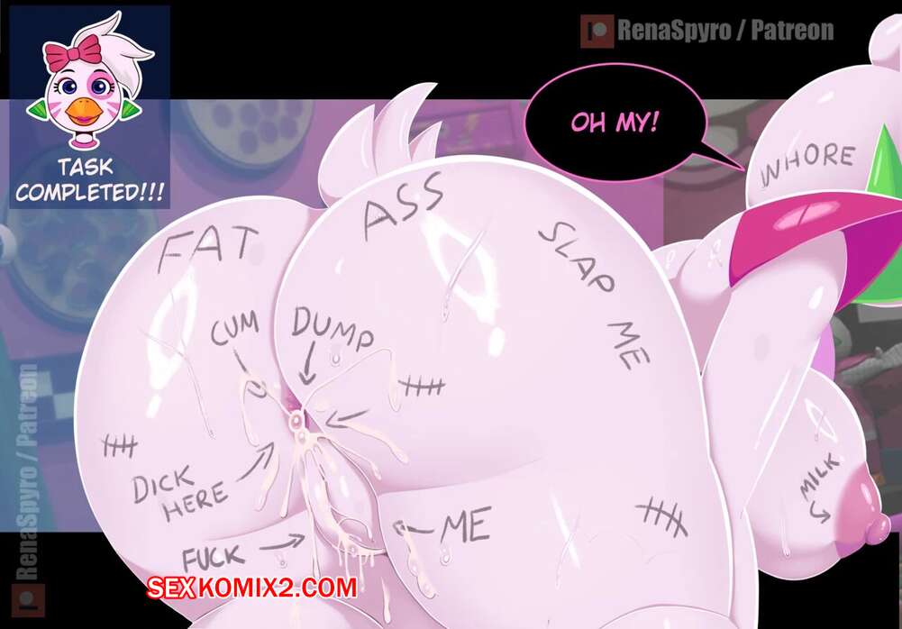 Порно комикс Five Nights At Freddys. Glamrock Chica. RenaSpyro Горячая красотка была очень возбуждена и решила повеселиться со своим дружком. Она разделась и отсосала хуй парня, после чего дала ему выебать свою пизденку и кончить в нее.