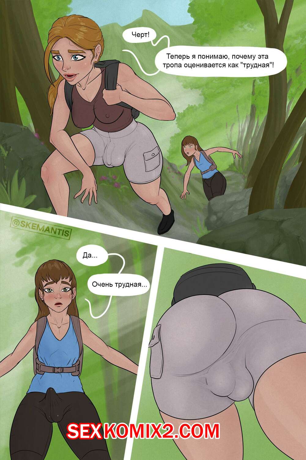 Порно комикс Друзья по пешему туризму. Skemantis Две горячие сисястые брюнетки с большими хуями отправились в пеший поход и решили повеселиться. Красотки разделись, после чего стали сосать большие хуи друг дружки.
