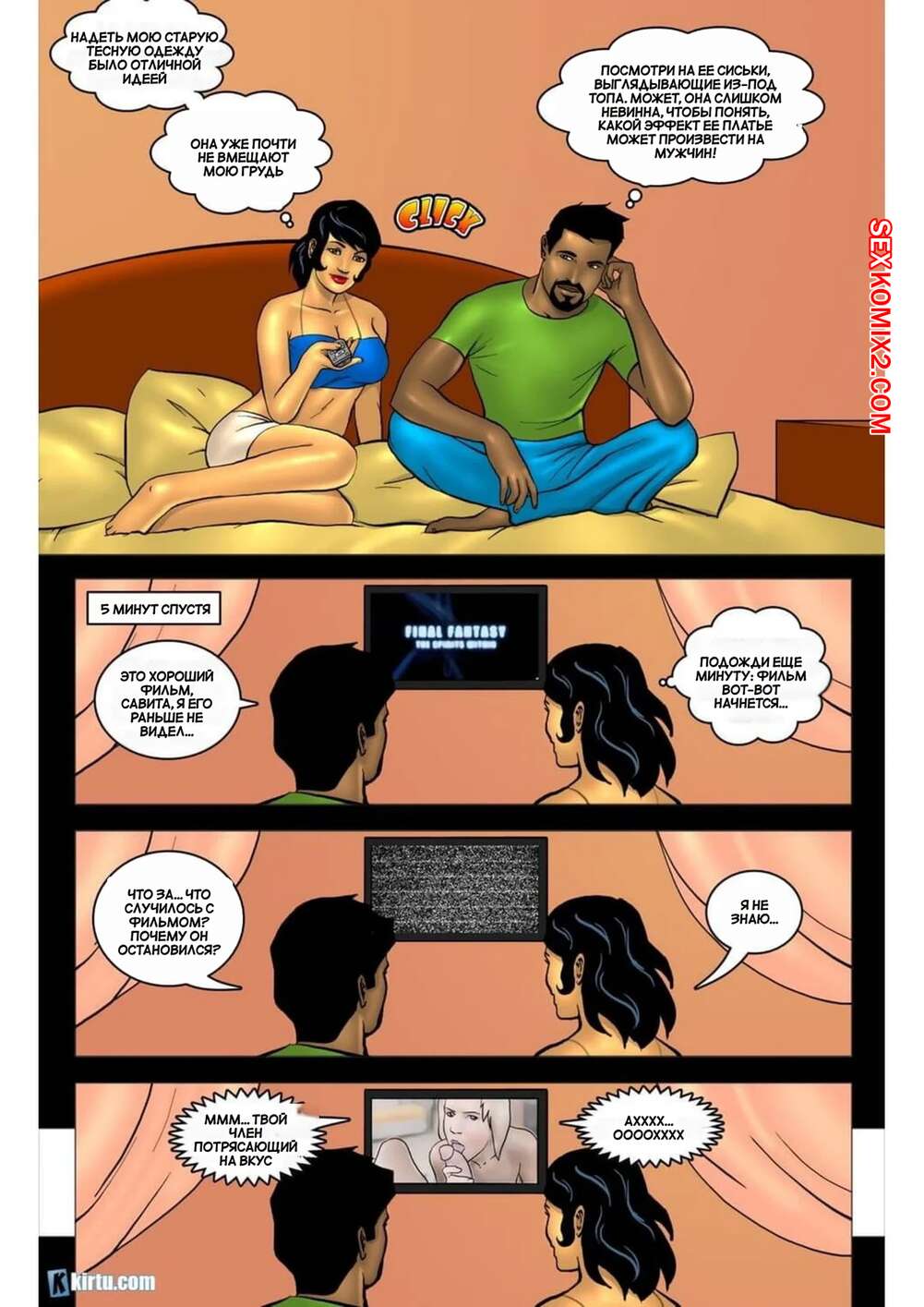 Порно комикс Савита 18. Часть 2. Извращенная хозяйка. Savita 18 Горячая брюнетка была очень возбуждена и решила повеселиться со своим темнокожим дружком, который пришел к ней в гости. Девушка разделась и отсосала большой хуй парня, после чего дала ему выебать свою пизденку.