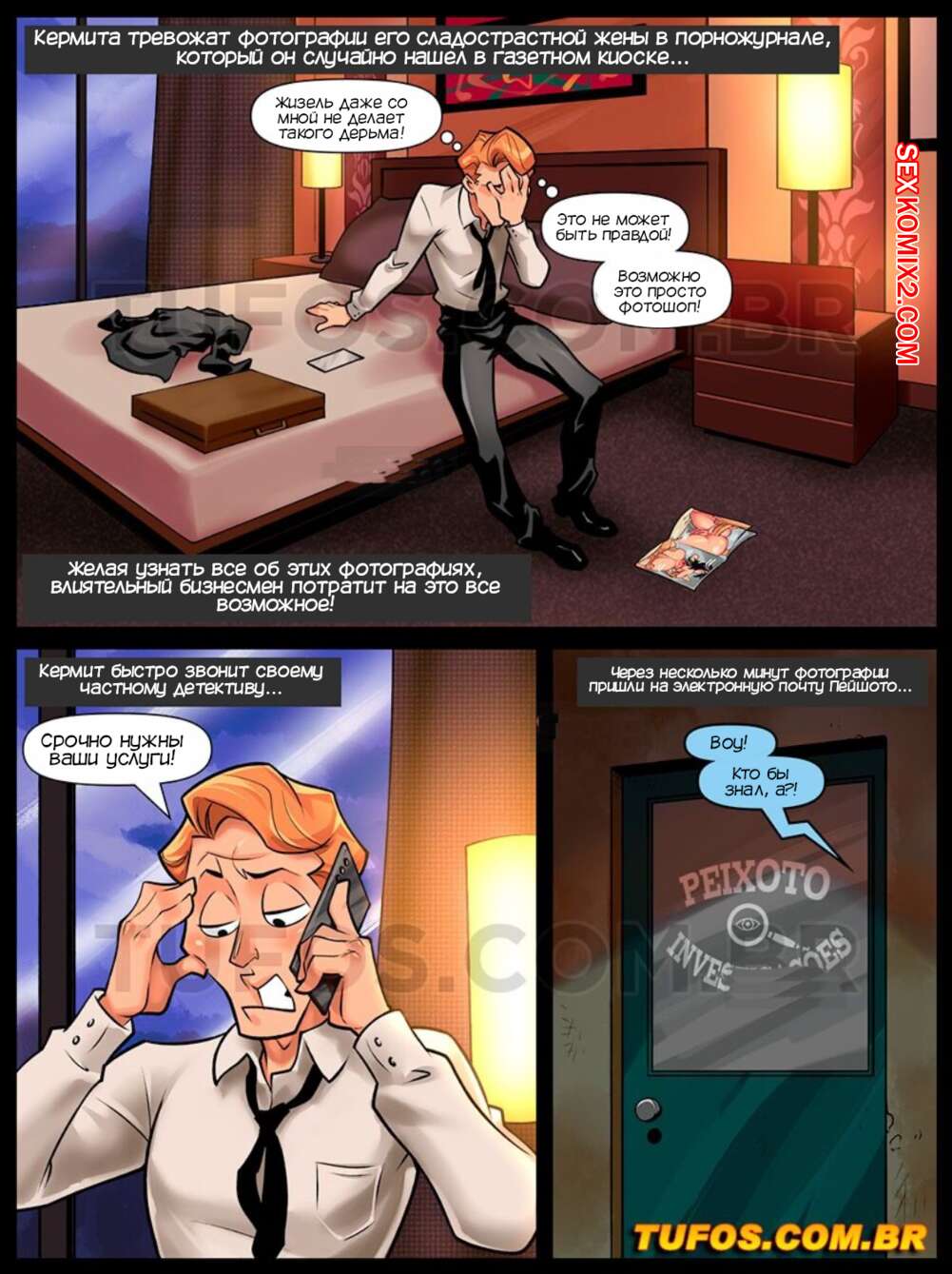Порно комикс Сладкие домохозяйки. Часть 11. Donas de casa volluptoosas. Tufos Парень нанял детектива, чтобы он провел расследование о порно фотографиях его жены. Мужчина отправился домой к девушке, чтобы изучить вопрос, но в итоге выебал милфу во все дырочки.