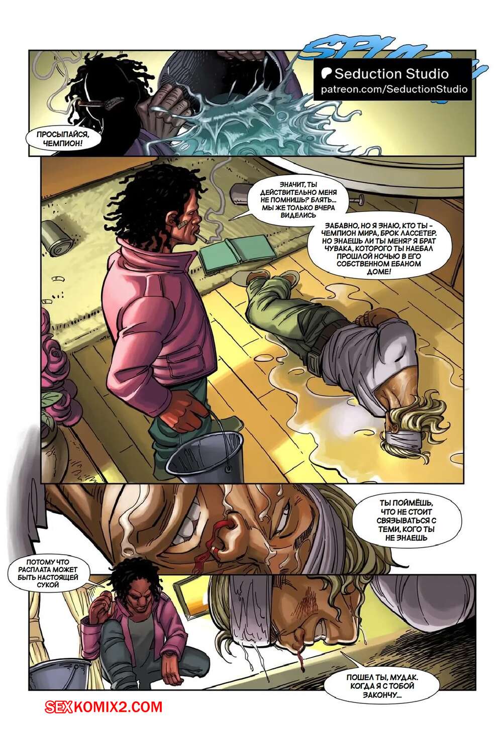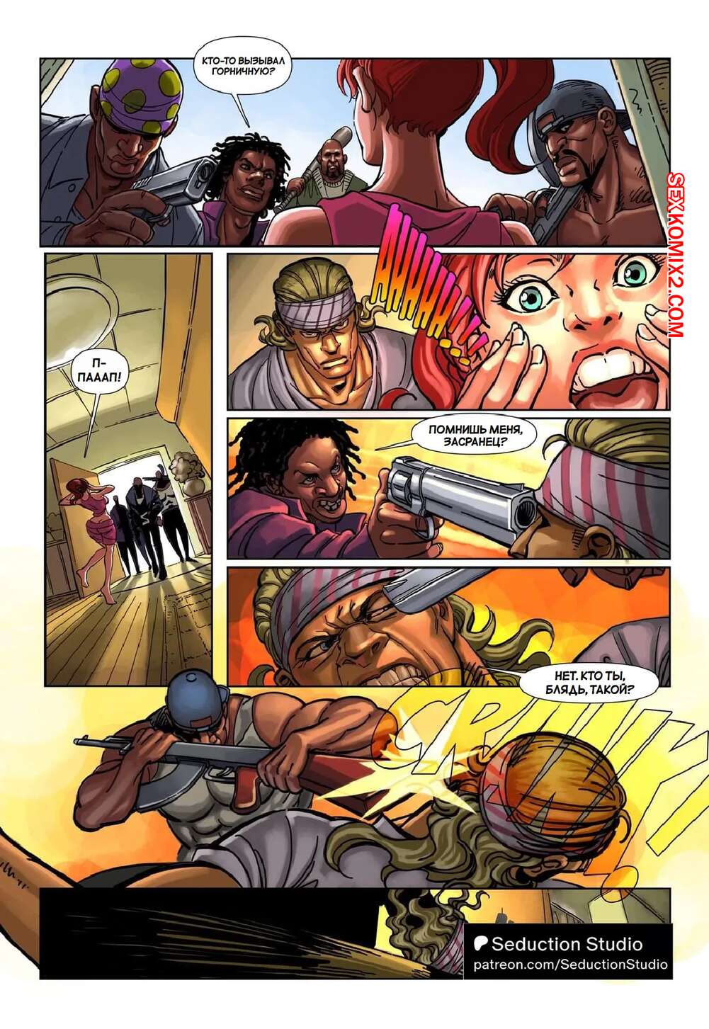 Порно комикс Жена бойца. The Fighters Wife. SeductionStudio Бандиты ворвались в дом бойца, где вырубили его и схватили жену парня и ее подругу. Темнокожие мужики раздели девушек и хорошенько выебали их во все дырочки, заполнив своей спермой.