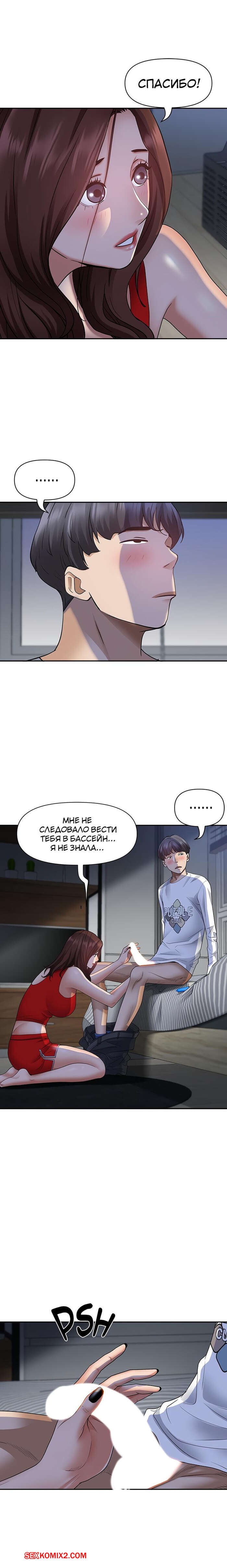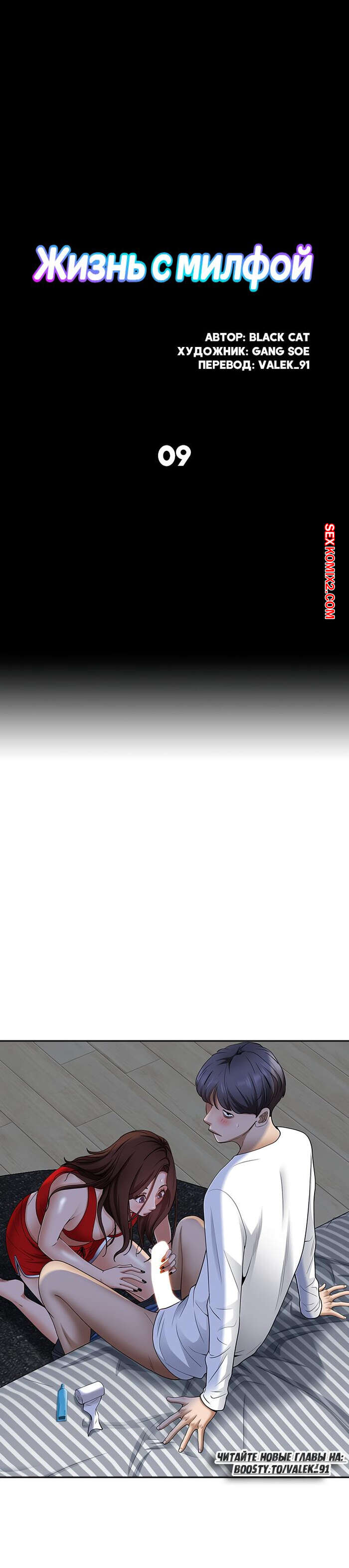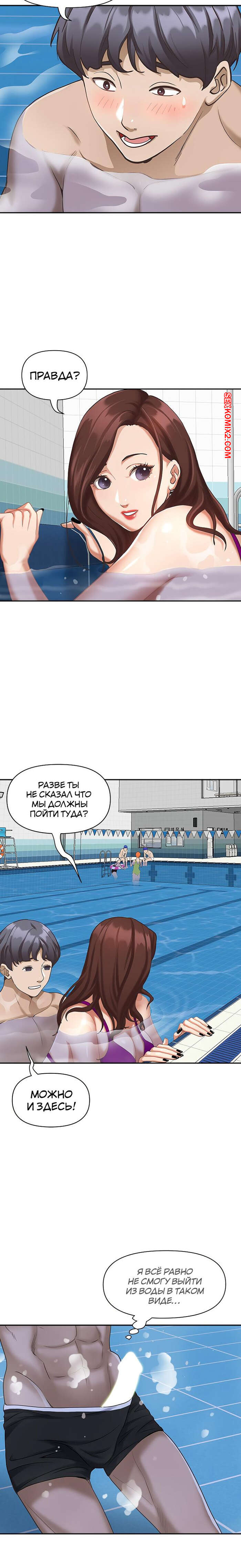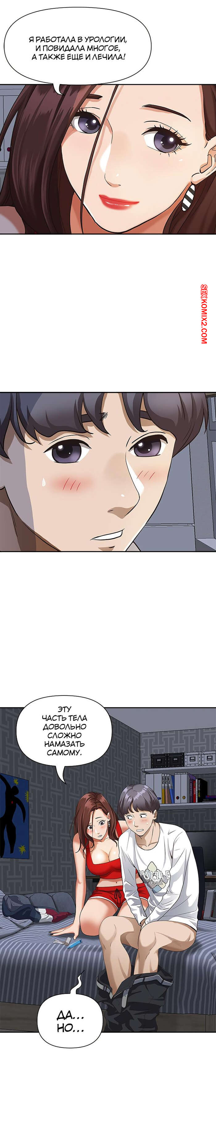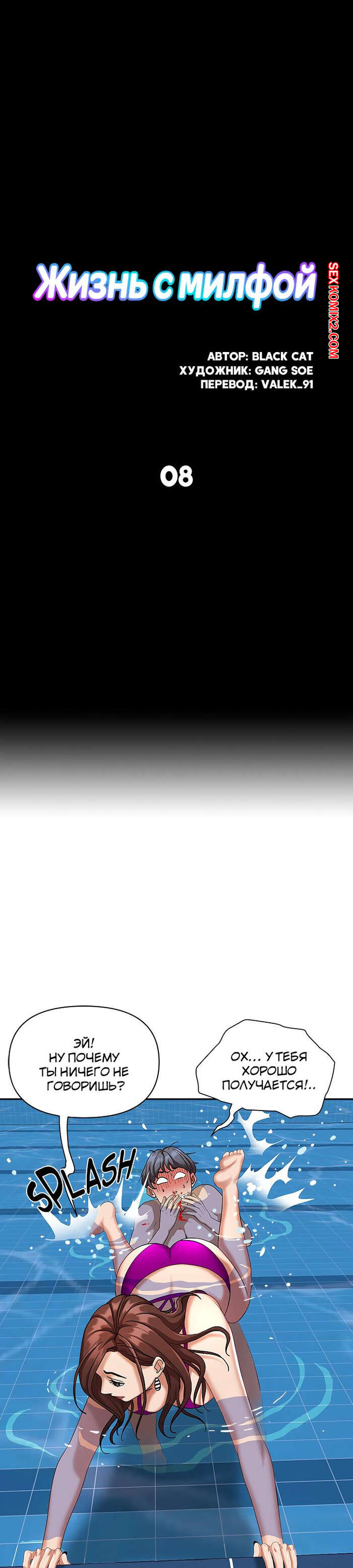 Порно комикс Жизнь с милфой. Часть 7 и 8 и 9. Married Woman Горячая милфа была очень возбуждена после тренировки в бассейне с парнем. Девушка усадила парня на кровать и встала перед ним на колени, после чего стала ласкать его большой хуй.