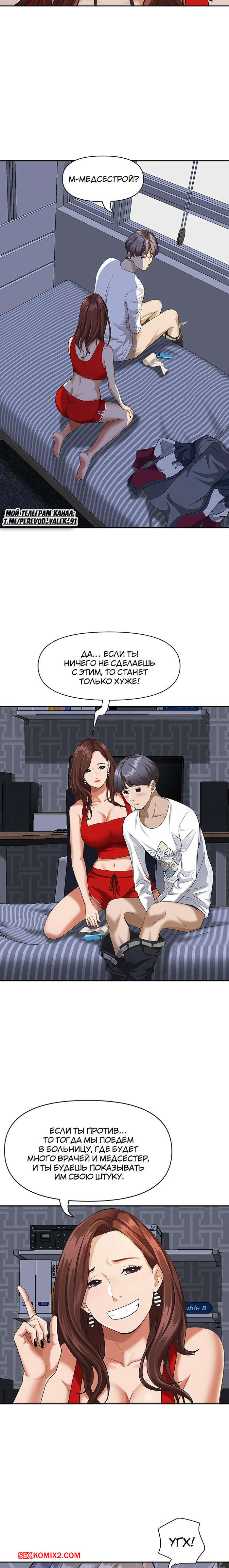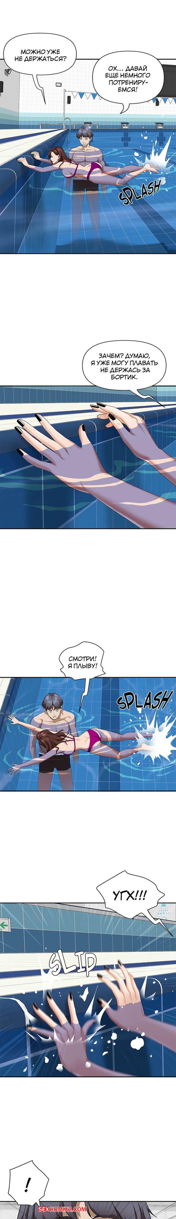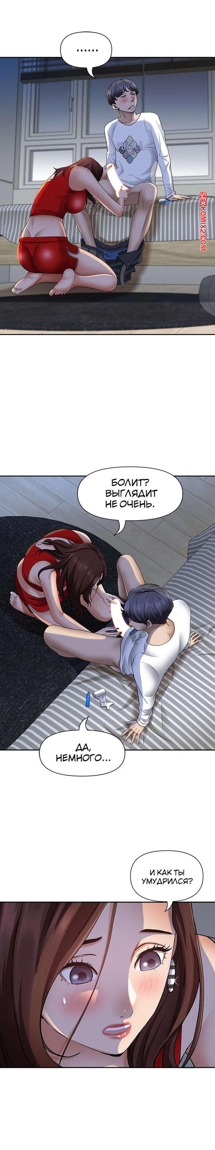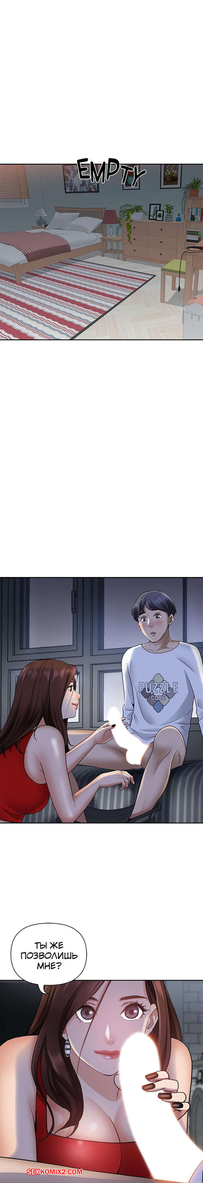 Порно комикс Жизнь с милфой. Часть 7 и 8 и 9. Married Woman Горячая милфа была очень возбуждена после тренировки в бассейне с парнем. Девушка усадила парня на кровать и встала перед ним на колени, после чего стала ласкать его большой хуй.