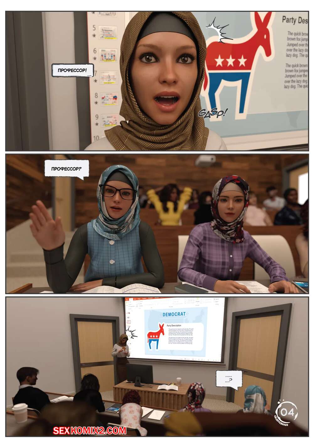 Порно комикс Непристойный контракт. Indecent Contract. Crispy Cheese. Горячая брюнетка хочет стать политиком, поэтому ей приходится вступать в сексуальные отношения с богатыми мужчинами. Девушка раздевается и сосет хуи парней, после чего они ее трахают.