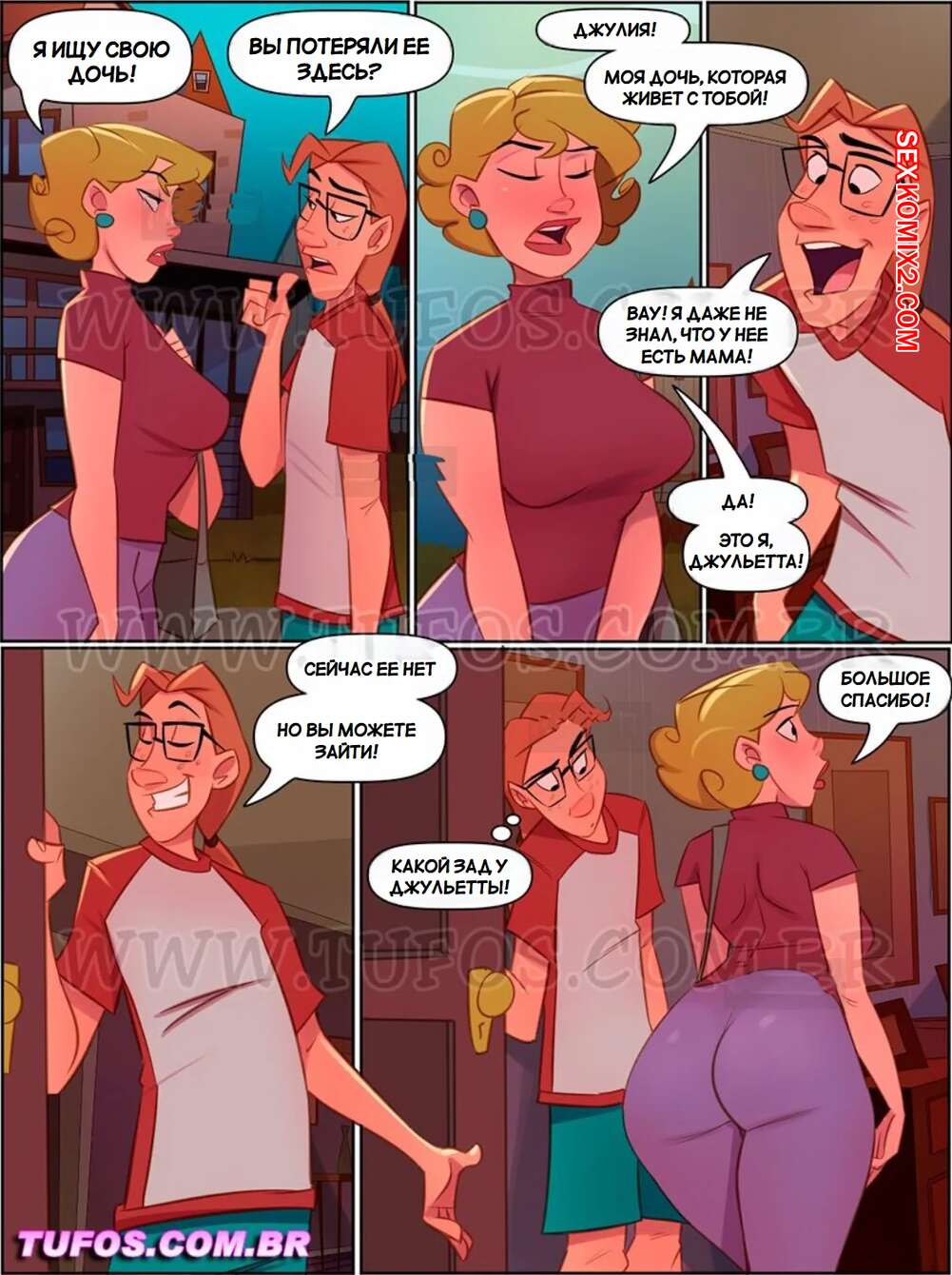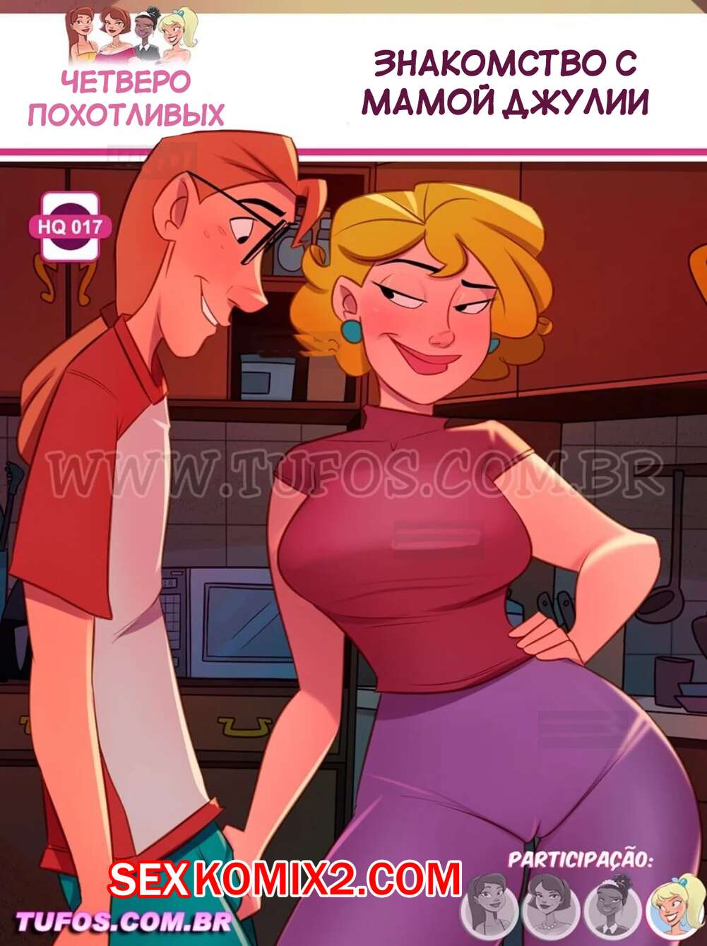Порно комикс Четверо похотливых. Часть 17. As 4 sacanas. Tufos Горячая милфа искала свою дочь и пришла домой к Карлиньосу. Они начали общаться и милфа заметила большой член парня. Красотка разделась и отсосала хуй юного паренька, после чего дала ему себя выебать.