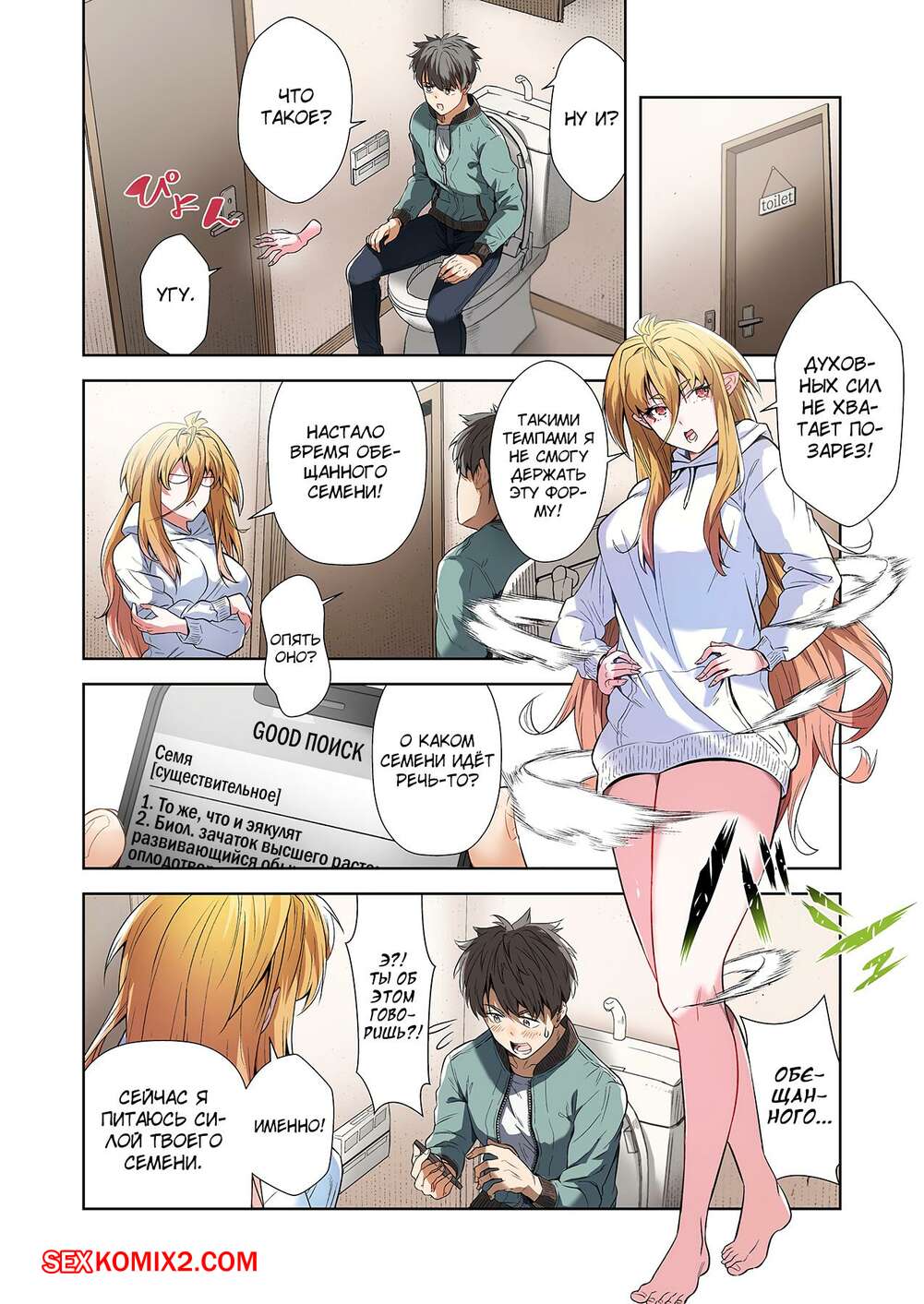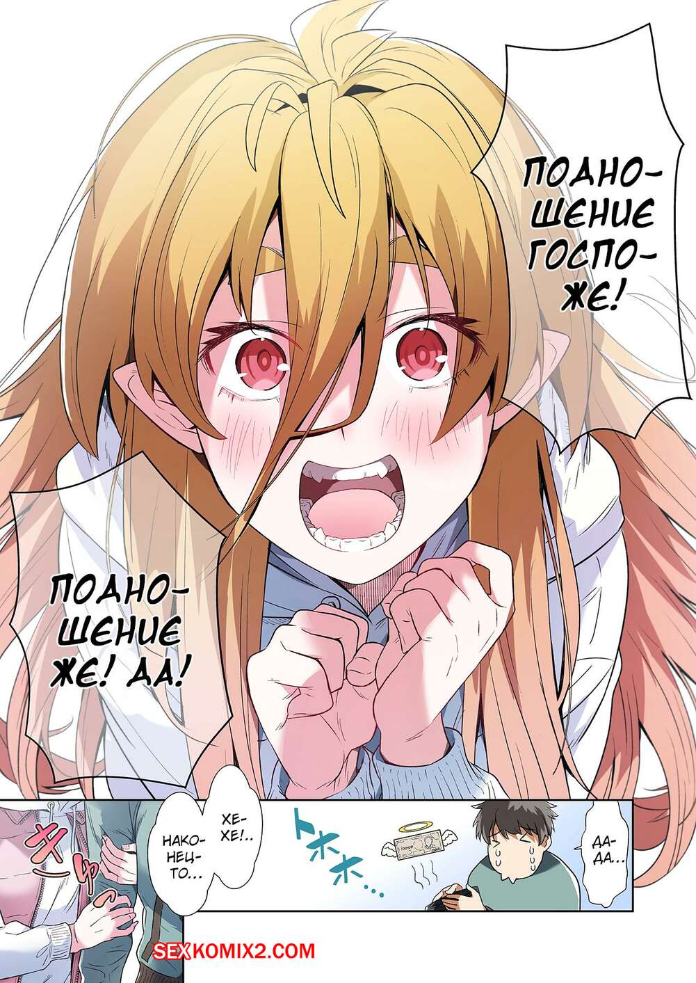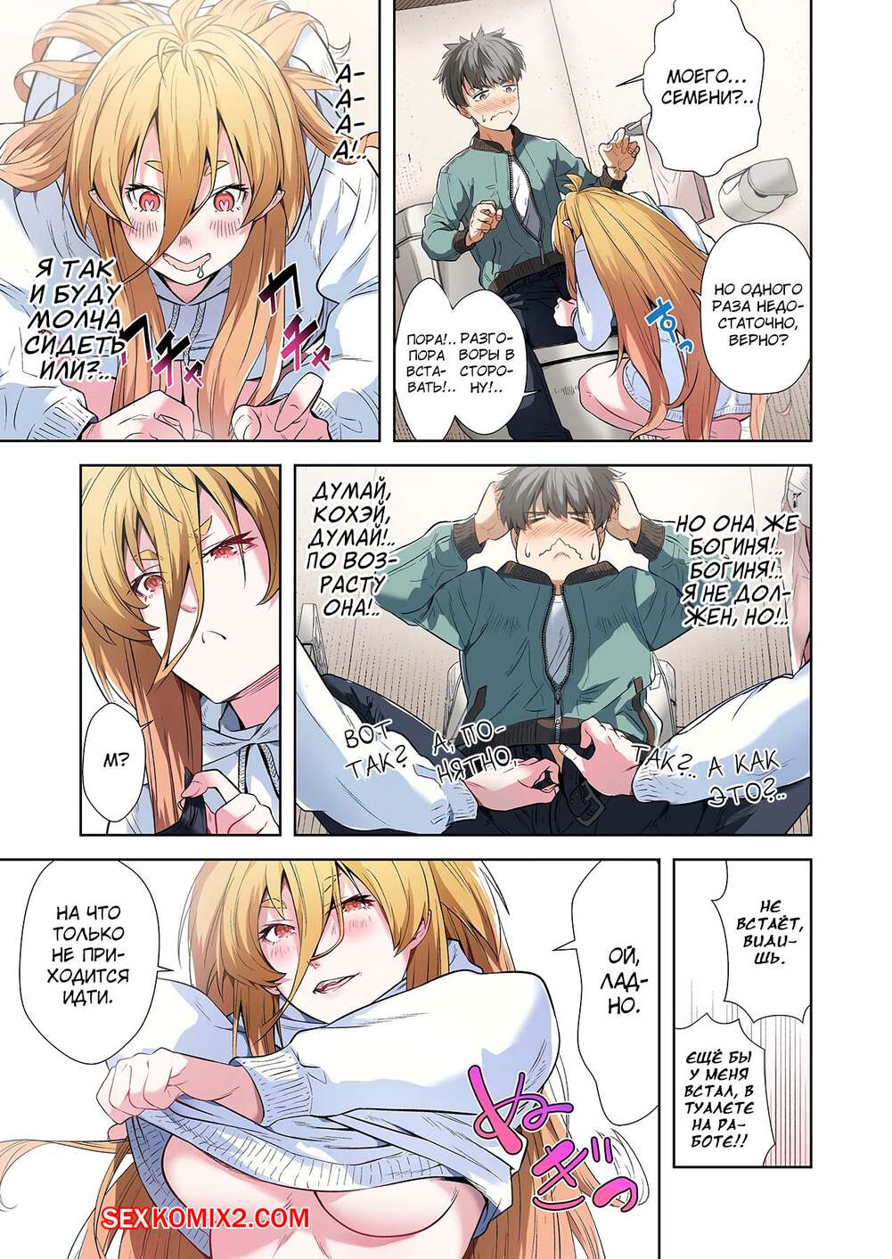 Порно комикс Левая рука богини. Отдайся же своей любовнице. Часть 3. MUGENUP Горячая блондинка была очень возбуждена и решила повеселиться со своим дружком. Она встала на колени и стала ласкать большой хуй парня, желая насладиться его спермой.