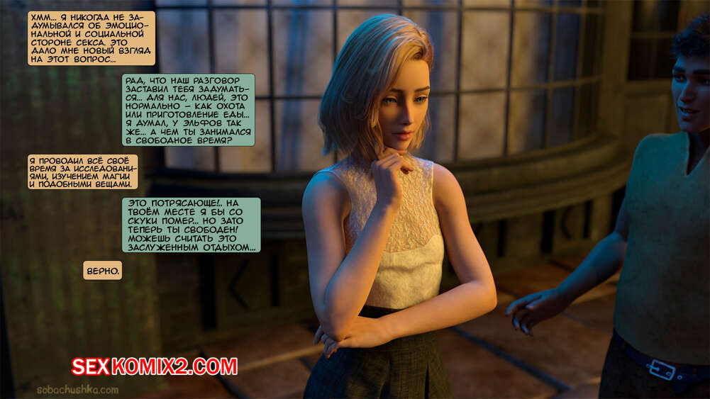 Порно комикс Мой соратник эльфийский принц. Часть 4. Kizaru3D Горячая брюнетка разделась перед парнем и уложила его на кровать. Она стала сосать большой хуй своего нового дружка, желая помочь ему расслабиться и обильно кончить.
