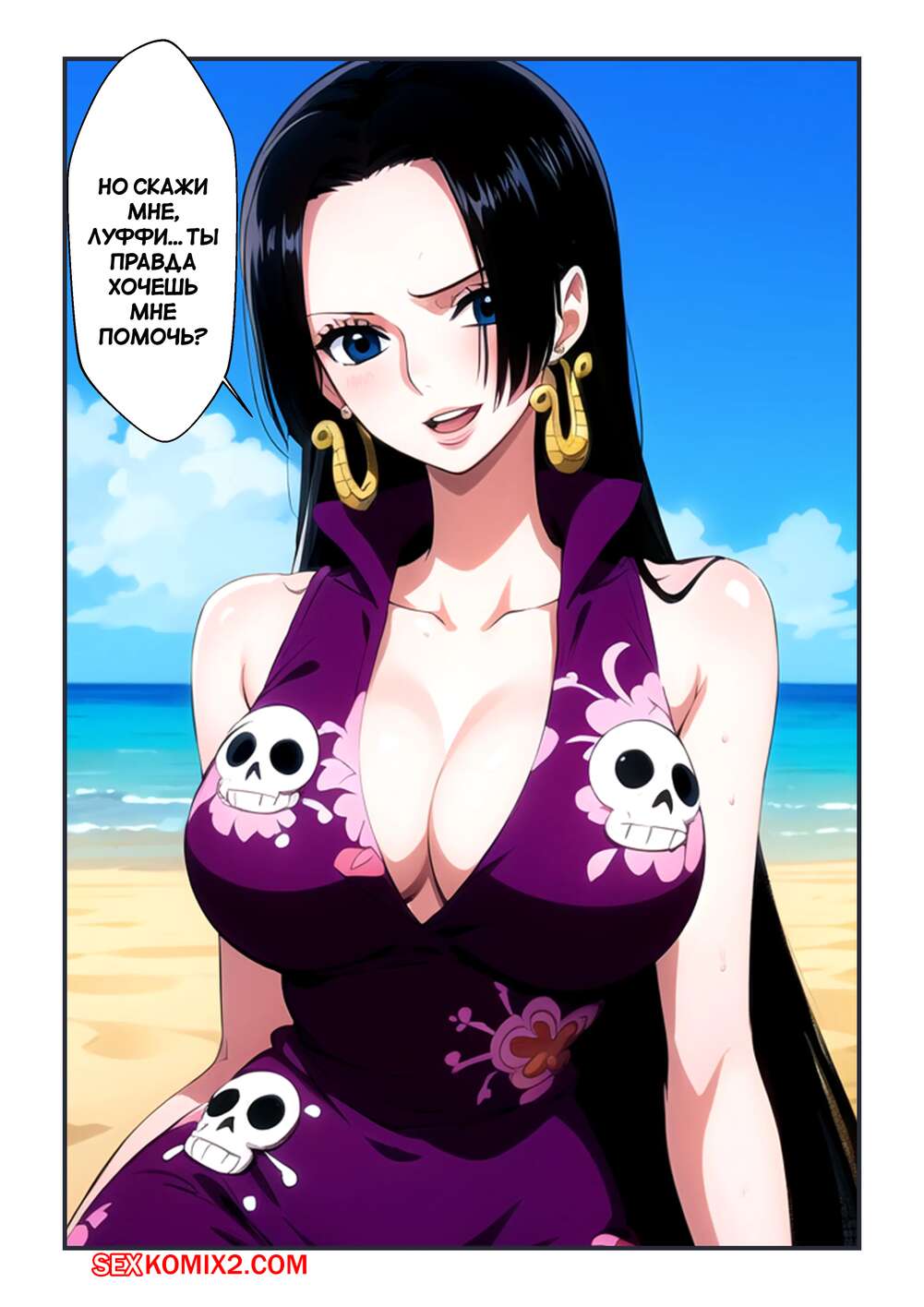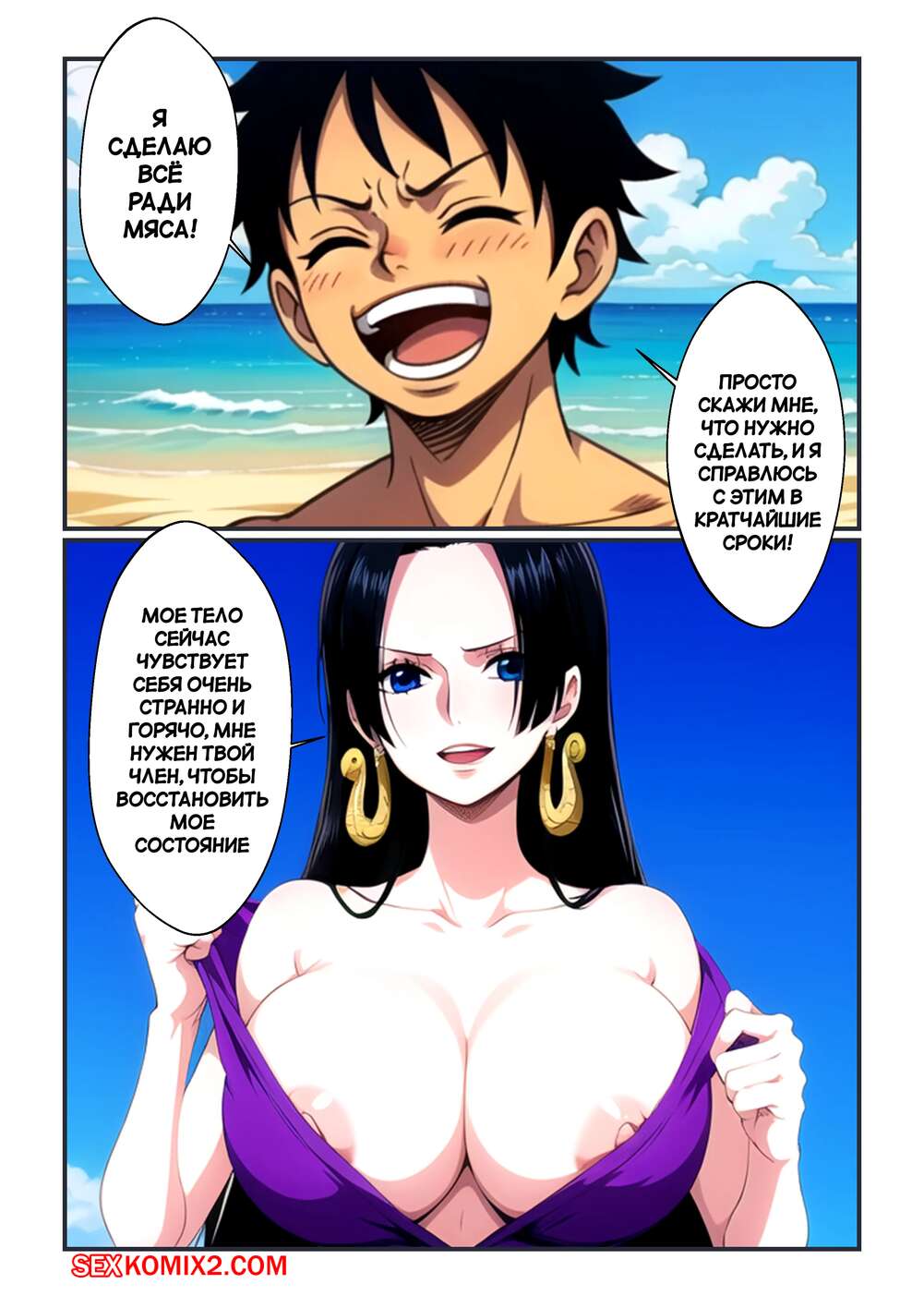 Порно комикс One Piece. Пляжное веселье Луффи и Хэнкок. Luffy and Hancocks Beach Fun. Kahoo Горячая брюнетка Хэнкок привела Луффи на пляж, желая повеселиться. Девушка разделась и стала сосать большой хуй парня, после чего дала ему себя хорошенько выебать.
