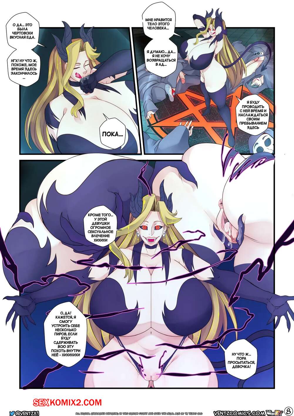 Порно комикс Темные соблазны. Dark Temptations. VentZX, BrayanEroArtist. Горячая брюнетка оказалась вовлечена в темный ритуал. Красотка перевоплотилась в возбужденную девушку в сексуальном наряде и отсосала большие хуи парней, после чего они выебали ее во все дырочки.