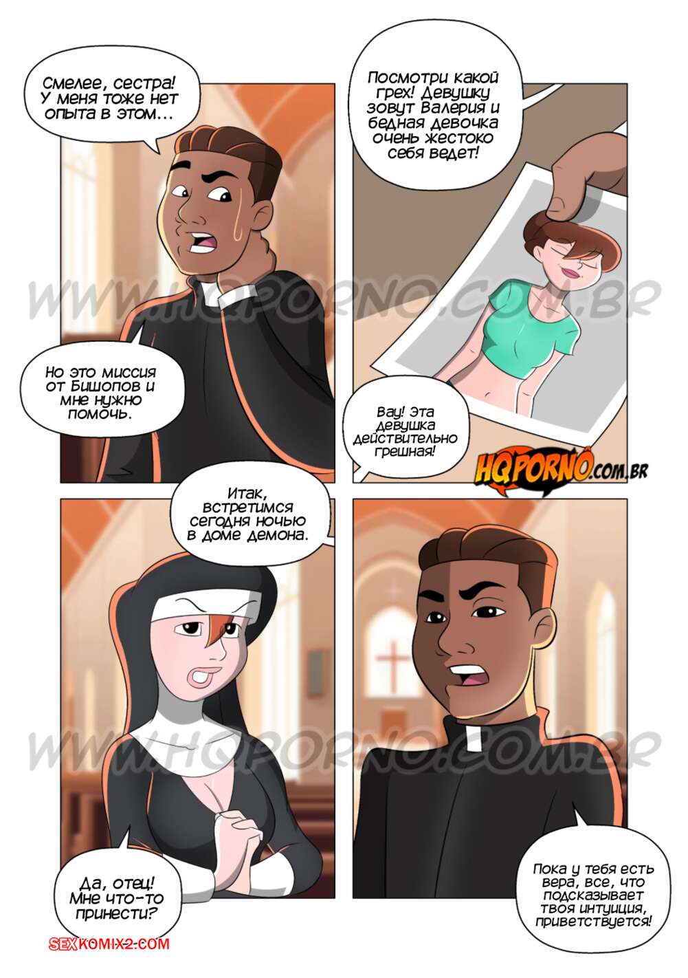 Порно комикс Монахиня. Часть 7. A freira. HQPorno Монахиня и святой отец отправились на экзорцизм юной девушки. Они раздели красотку и возбудили, после чего выебали ее во все дырочки, изгнав демона из брюнеточки.