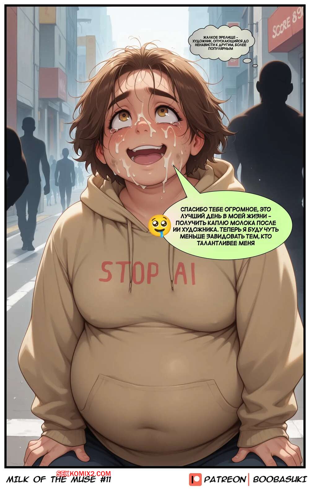 Порно комикс Молоко Музы. Milk of the Muse. boobasuki. Рыжая красотка с огромными сиськами гуляет по городу, привлекая внимание парней. Девушка оголяет свою грудь, после чего дает парням сососать свои сиськи и получить ее молочко.