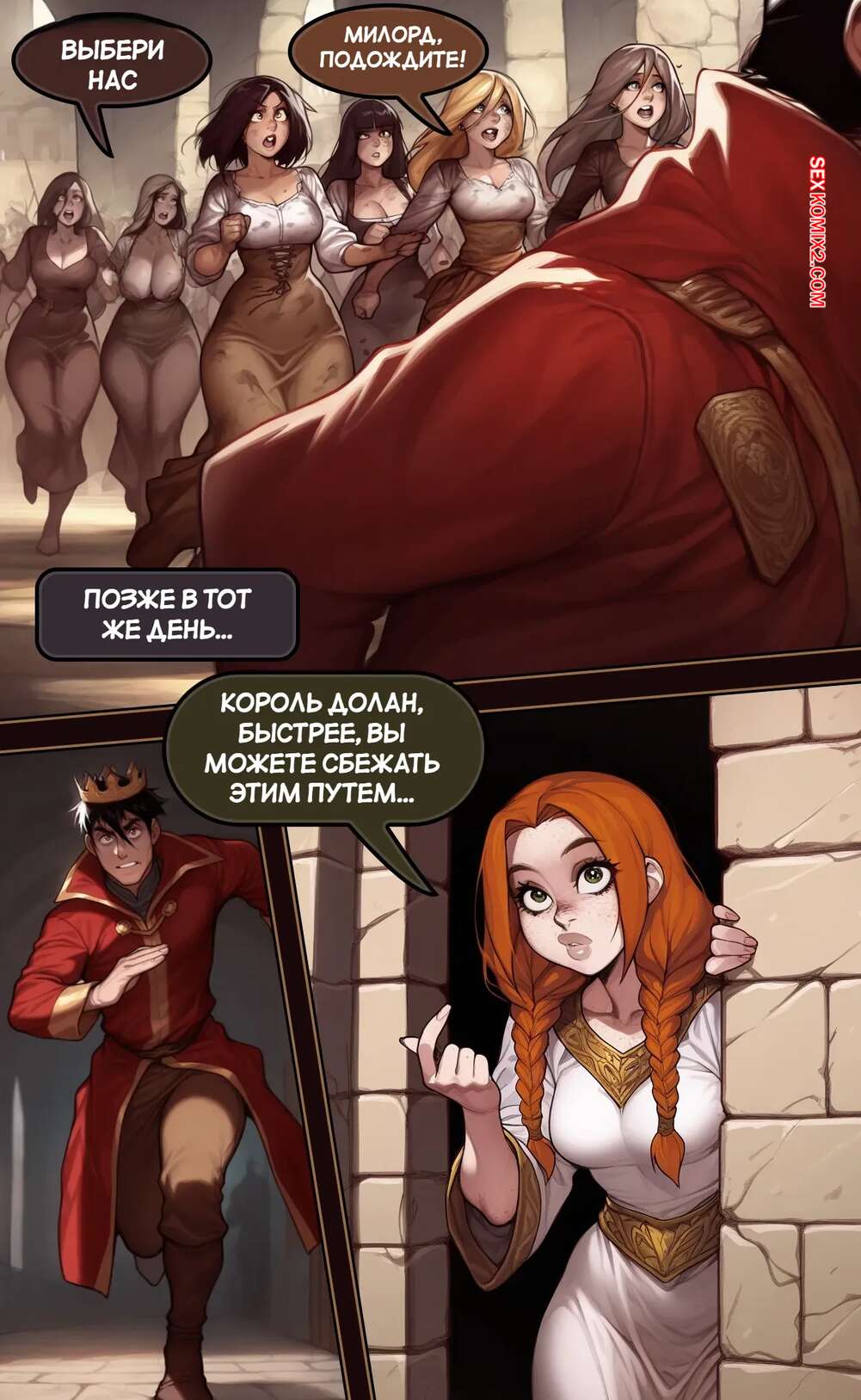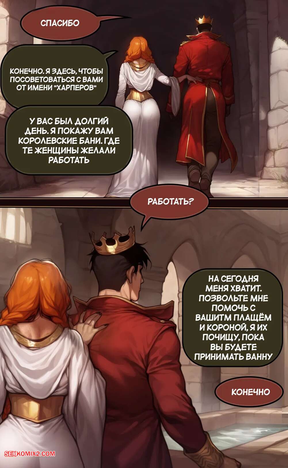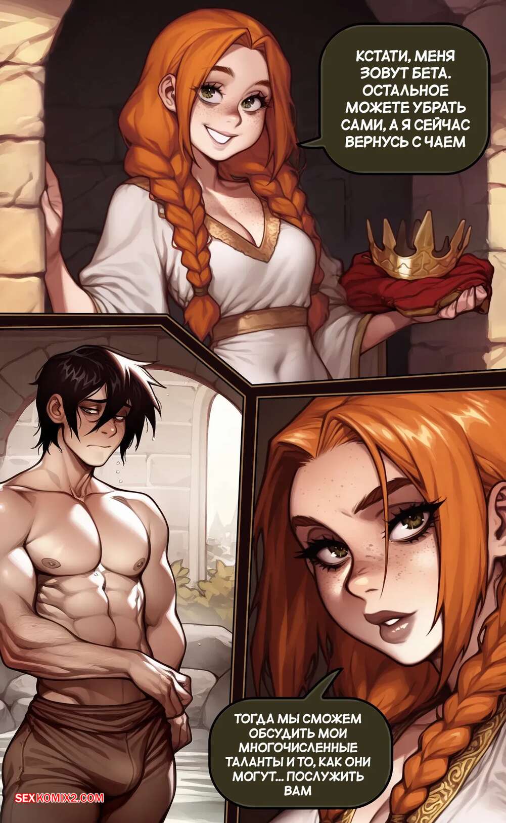 Порно комикс Убежище Харпера. Новый король. Harpers Keep. The new King Горячая брюнетка решила соблазнить нового короля, чтобы занять место на престоле. Она пришла к нему, пока она купался, и стала дрочить его хуй большими сиськами, предлагая королю жениться на ней.