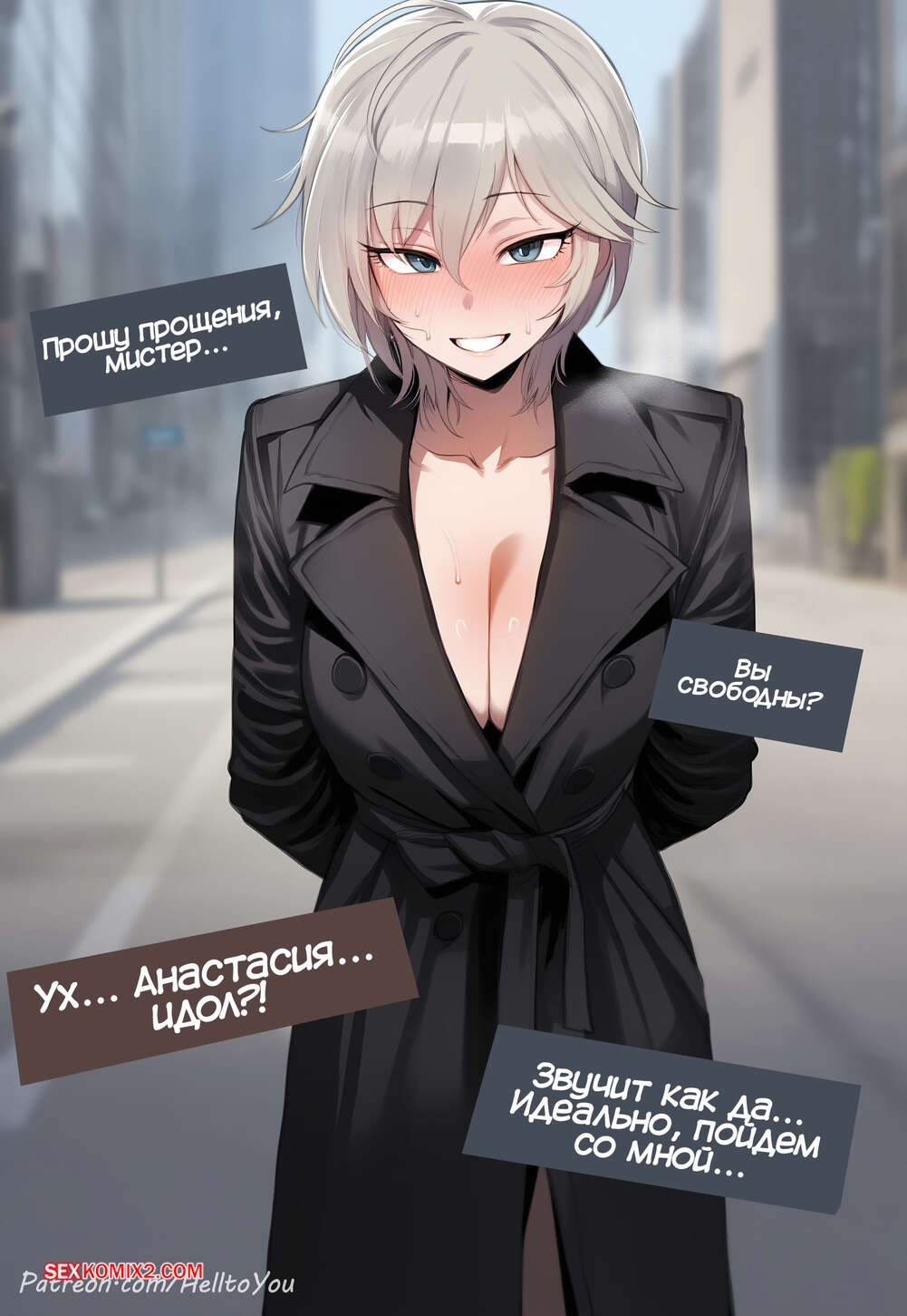 Порно комикс Проституция Анастасии. Anastasia Prostitution. HellToYou Горячая блондинка Анастасия встретила на улице темнокожего парня и позвала его трахаться. Девушка встала на колени и отсосала хуй фаната, после чего дала ему выебать свою пизденку и кончить в нее.