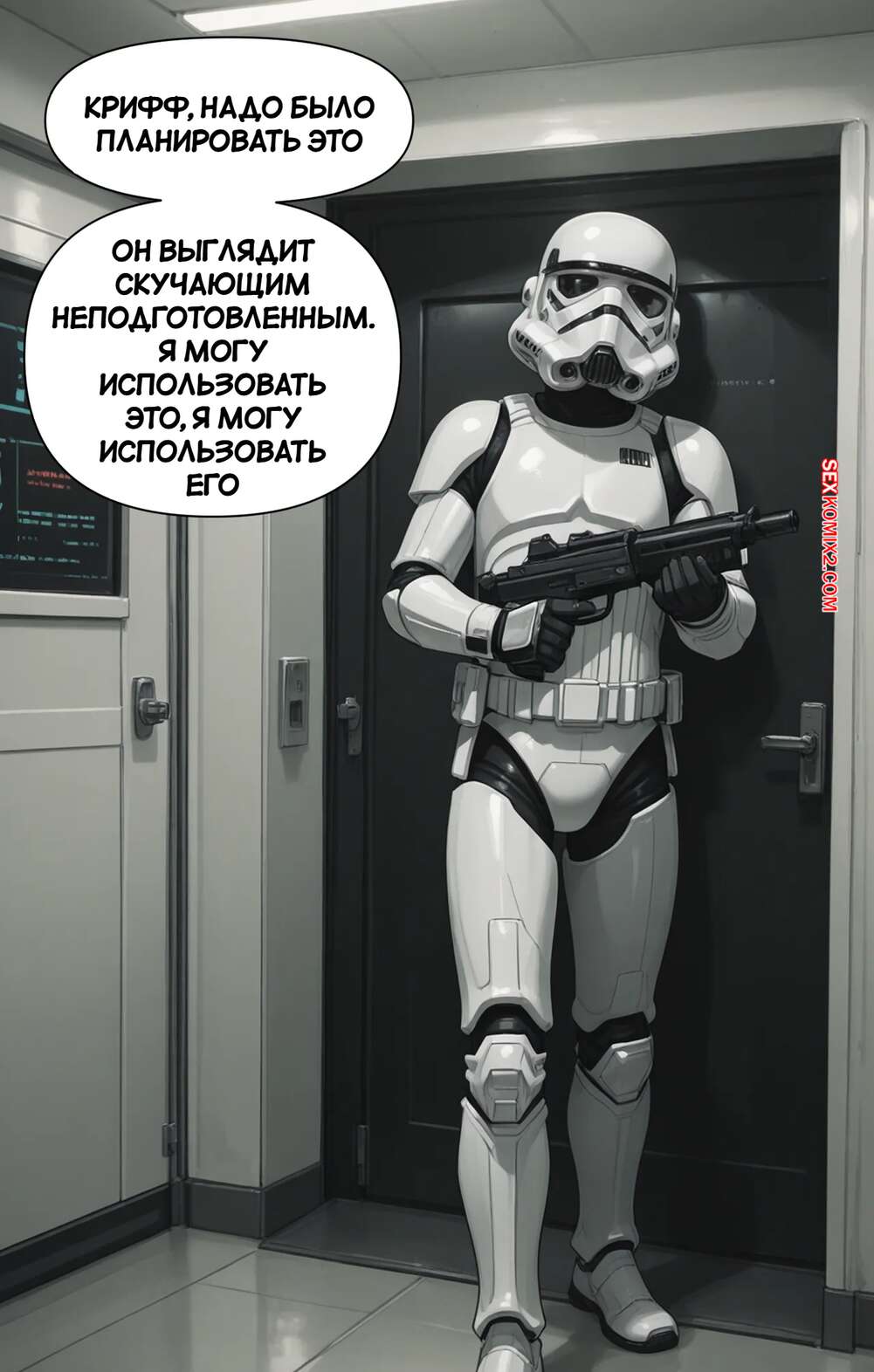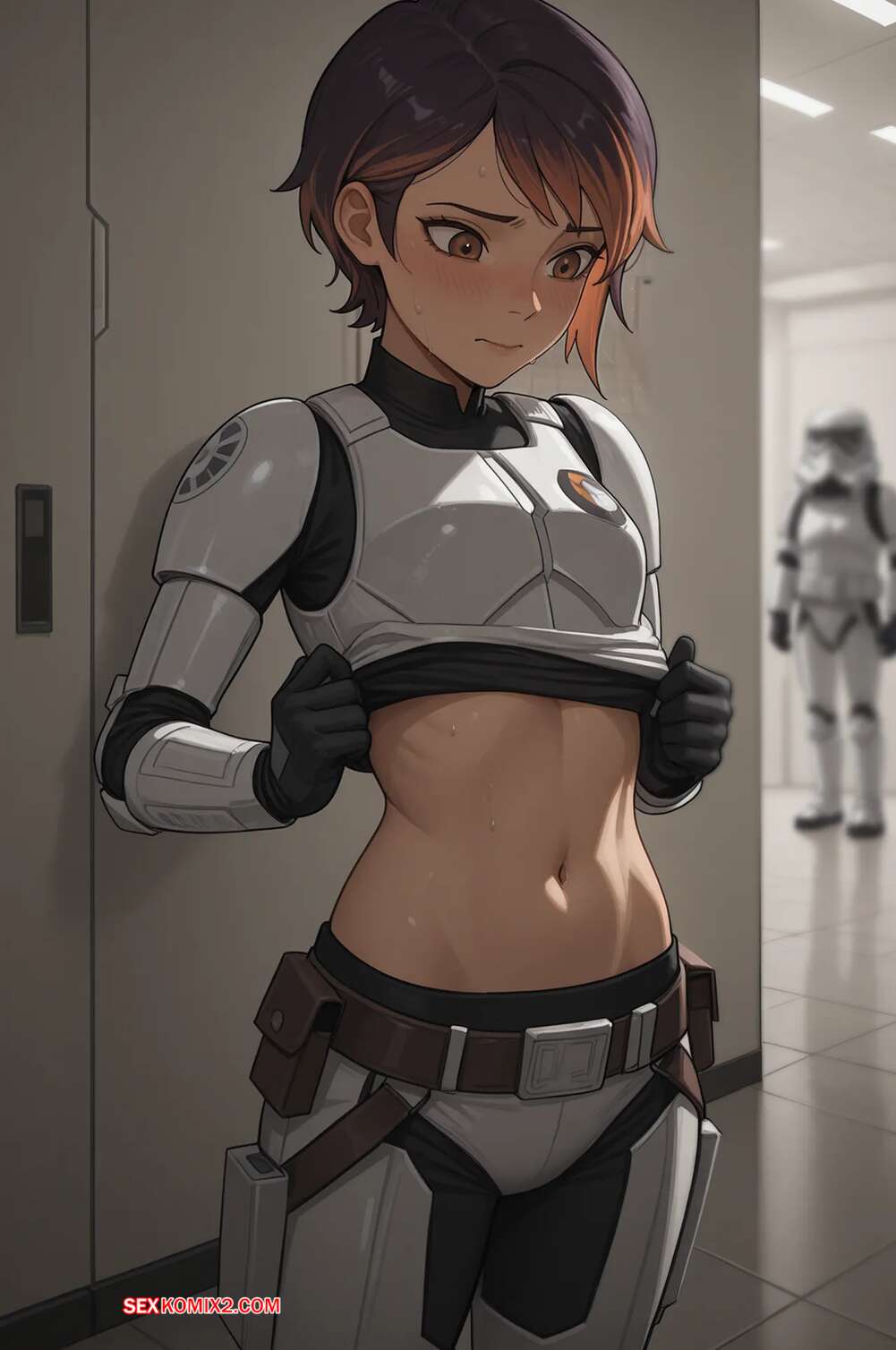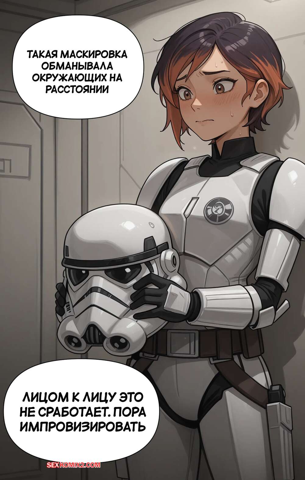 Порно комикс Звездные войны. Искусство обмана. The Art of Deception. Scarlet Meow Горячая брюнетка боялась раскрытия, поэтому разделась перед штурмовиком и соблазнила его шикарным телом. Красотка отсосала хуй парня, после чего дала ему себя выебать.