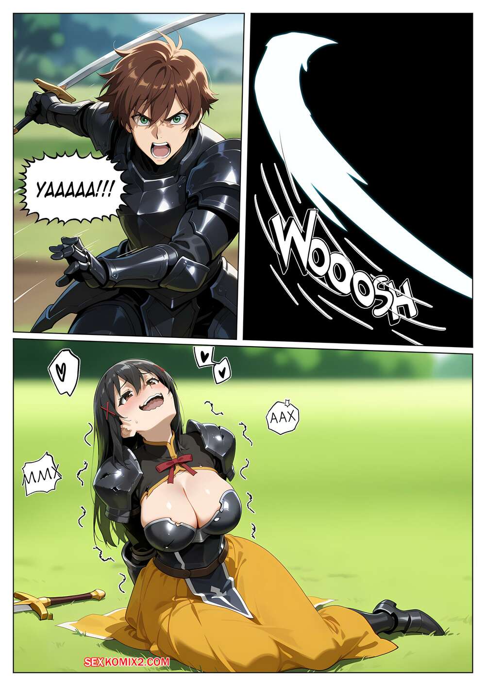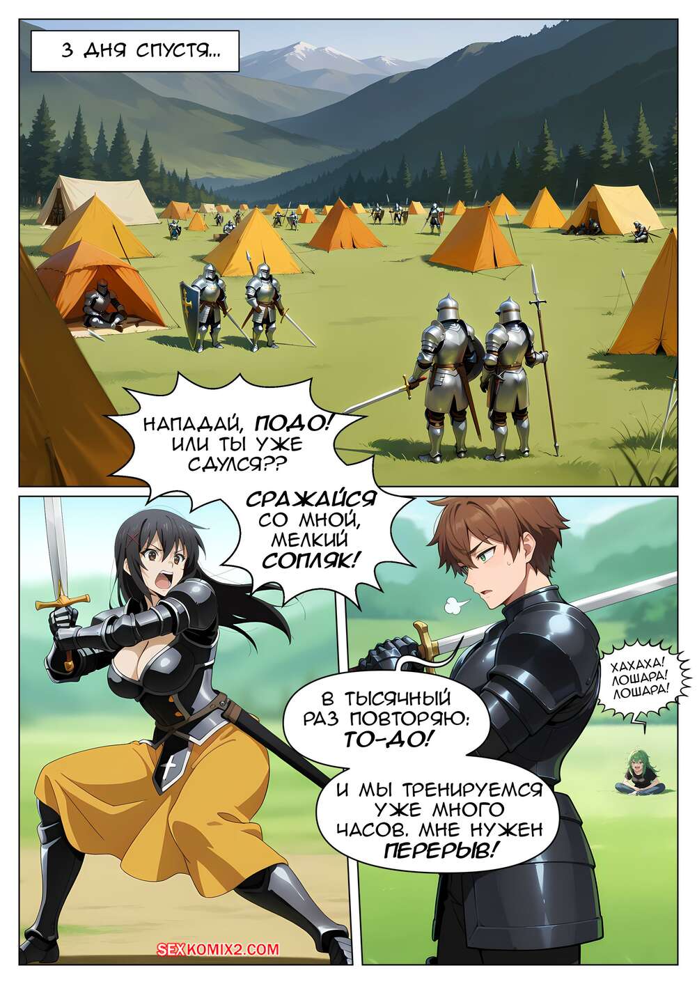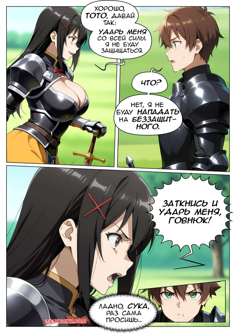 Порно комикс Как быть героем. Часть 4. How to be a hero Парнишка рыцарь возбудился, увидев шикарное тело брюнеточки. Он раздел красотку и прижал ее к дереву, после чего хорошенько выебал ее пизденку своим большим хуем.