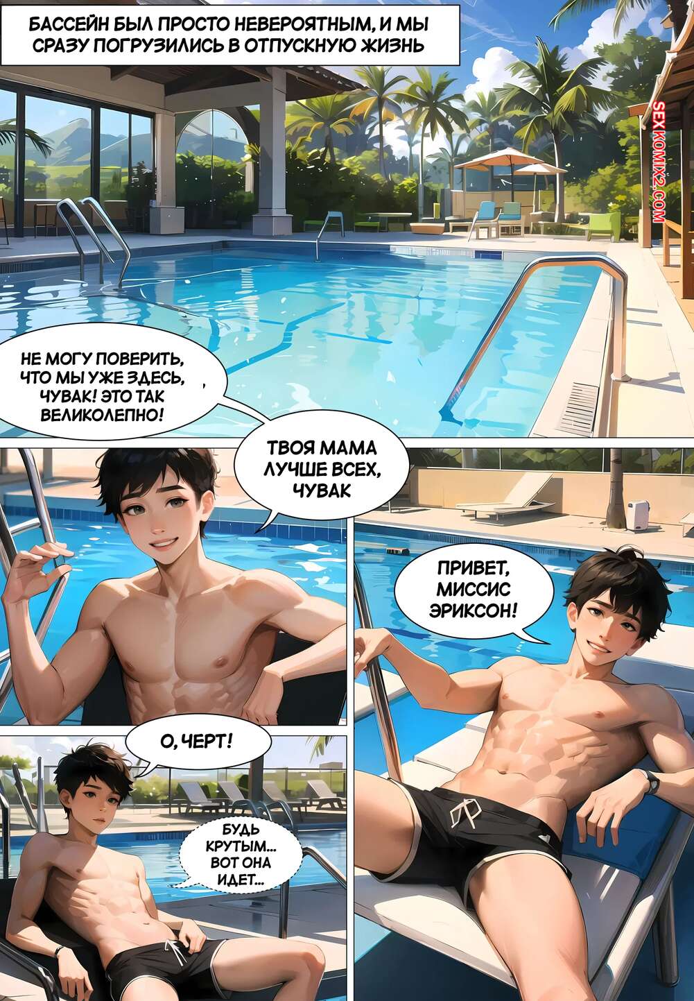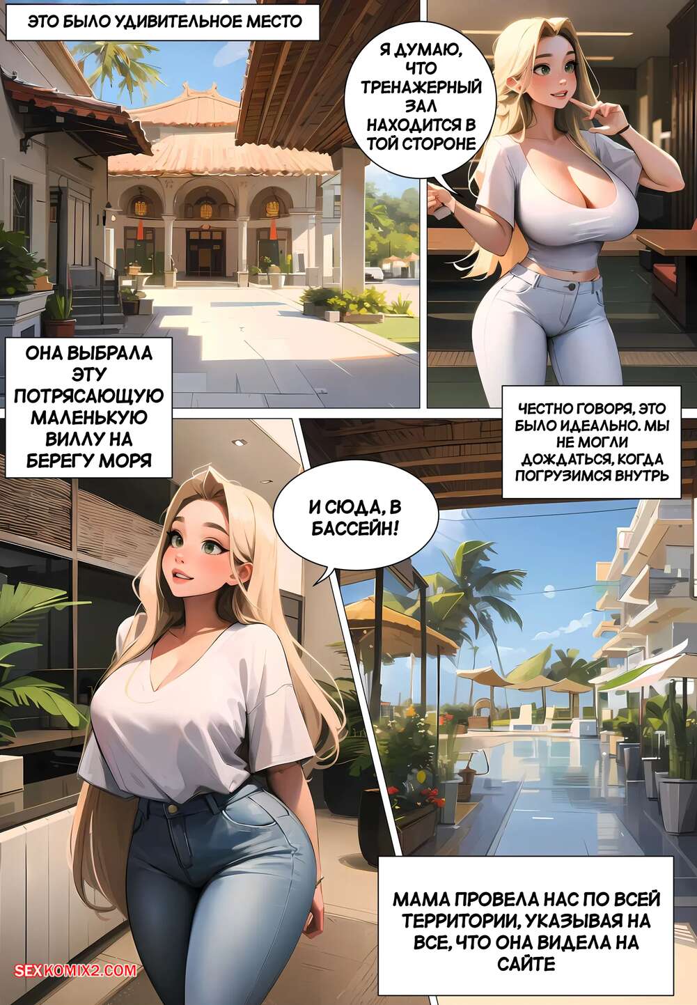 Порно комикс Летние каникулы Анона. Часть 2. Anons Summer Vacation. Kate Sketches Горячая блондинка отдыхала у бассейна и положила глаз на накаченных парней вокруг. Девушка отправилась в свой номер и стала трахать свою пизденку с помощью дилдо.