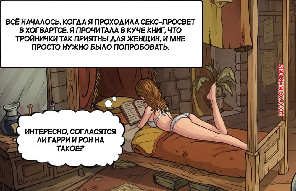 Порно комикс Гарри Поттер. Гермиона вспоминает о прошлом. Hermione reminisces about the past Красотка Гермиона скучала вечером и решила вспомнить былые времена в Хогвартсе. Там девушка была очень разрвратной и часто соблазнят Гарри и Рона, чтобы они выебали все ее дырочки.