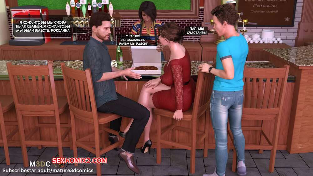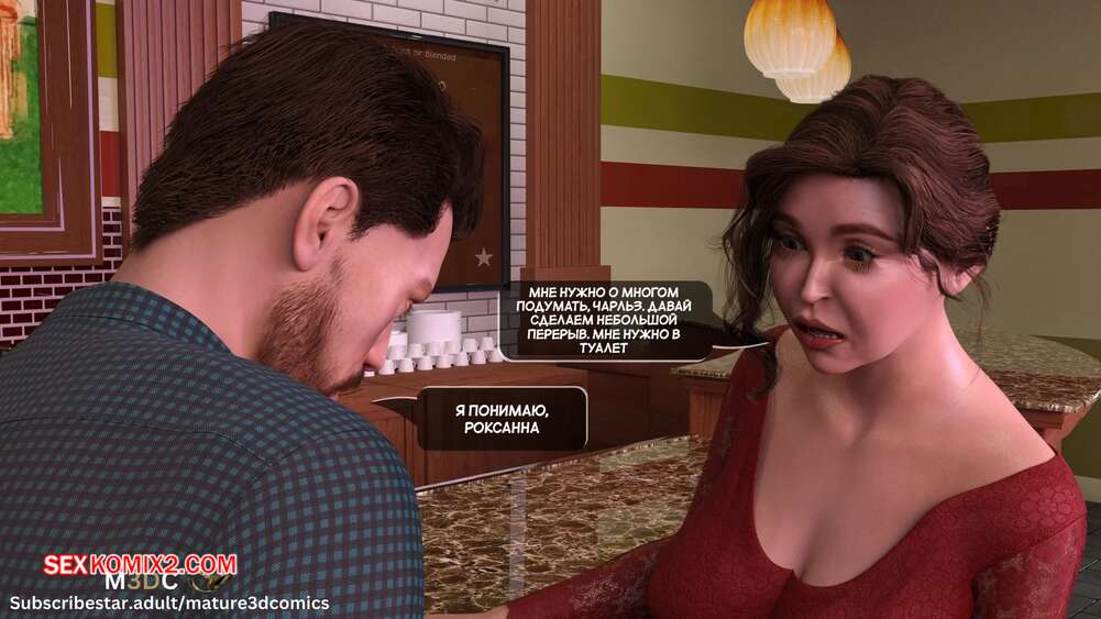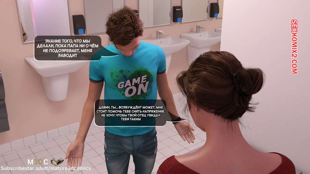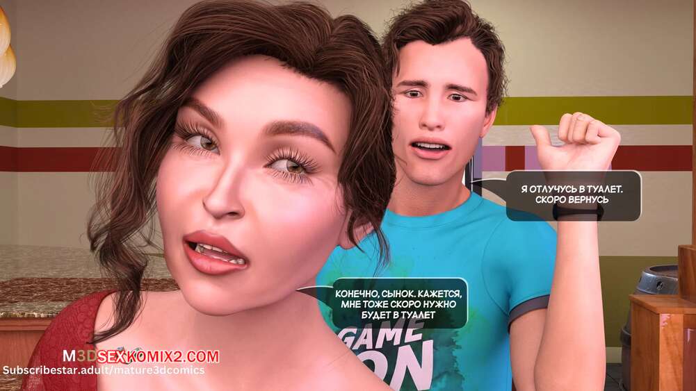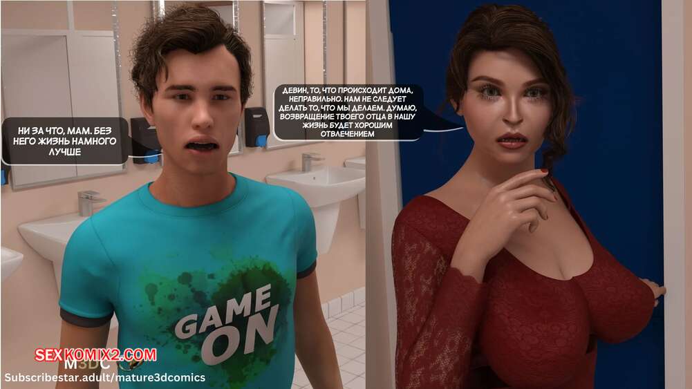 Порно комикс Полуночный вояж. Часть 4. Midnight Voyuer. Mature3DComics Горячая милфа с сыном пришли в кафе, чтобы встретиться с ее бывшим мужем. Красотка и Девин отправились в туалет, где мамочка раздвинула ножки и дала парню себя выебать и кончить ей в пизденку.