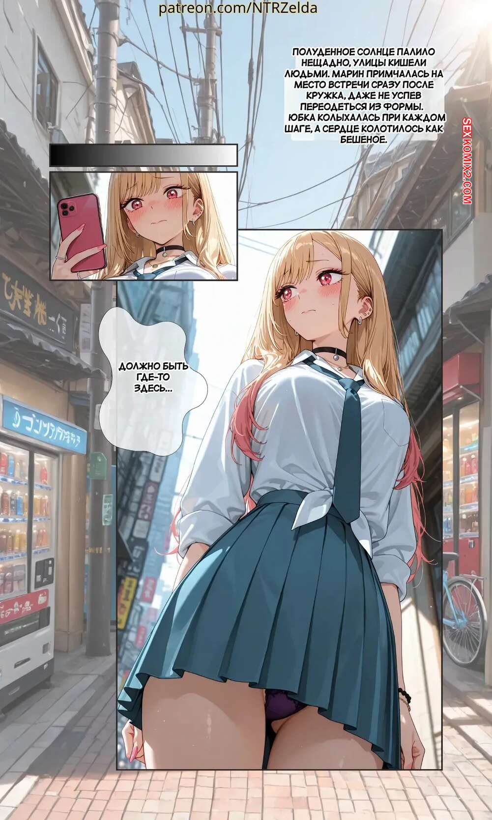 Порно комикс За закатом. Китагава. Beyond The Sunset. Kitagawa. NTRzelda. Парень пригласил горячую блондинку к себе домой, желая повеселиться. Он раздел сучку и поставил ее на колени, после чего сунул ей в рот свой член, чтобы она ему отсосала.