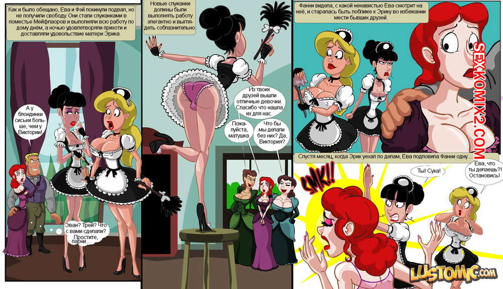 Порно комикс Фанни. Fanny. Часть 4. Fanny And The Mayflower Maids Горячая милфа продолжает издеваться над своей рабыней с большим хуем. Она зовет своего дружка, чтобы он выебал их обоих, а затем сама начинает трахать ее в жопу, кайфуя от этого всего.